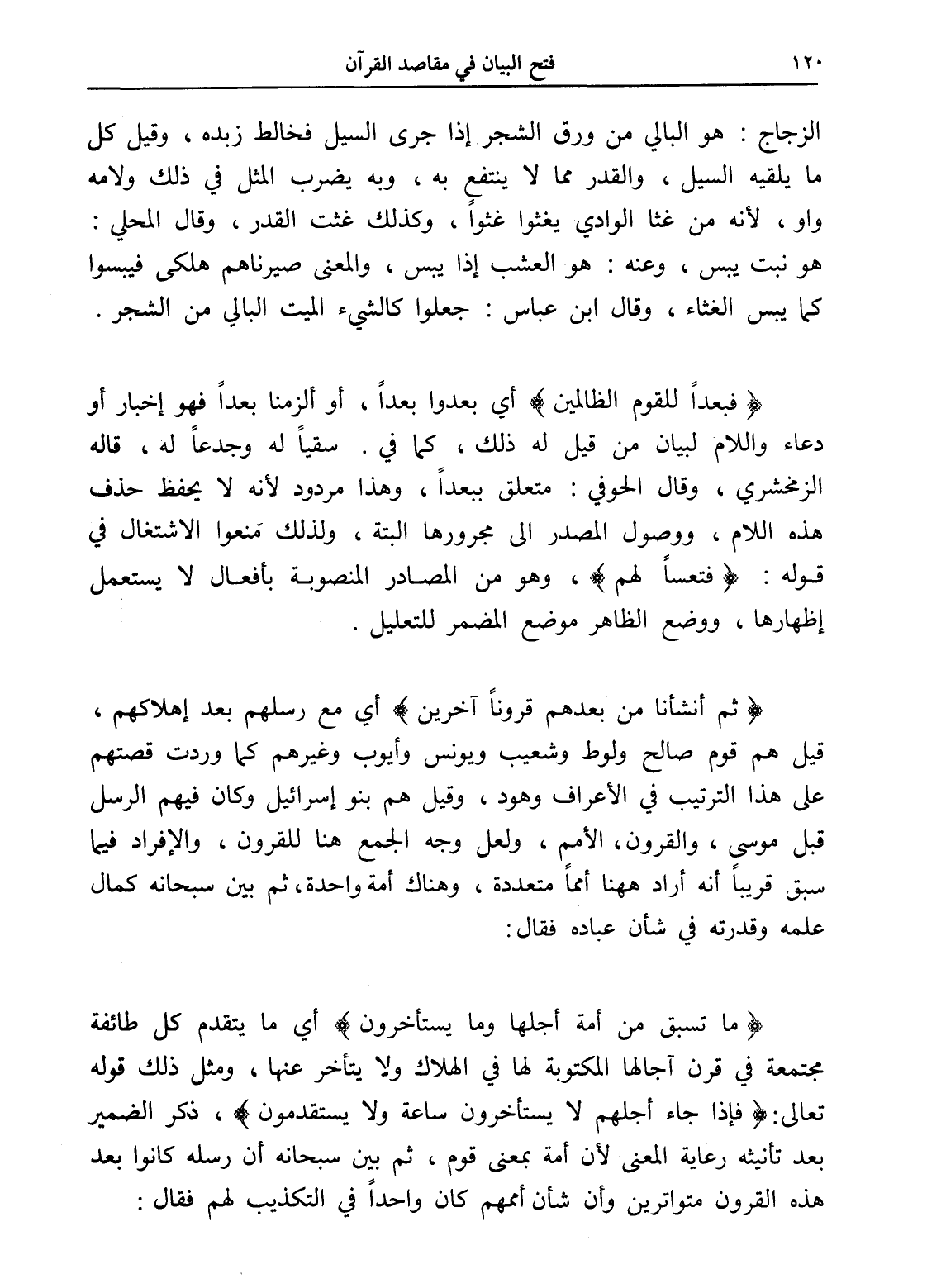 (ما تسبق من أمة أجلها وما يستأخرون) أي ما يتقدم كل طائفة مجتمعة في قرن آجالها المكتوبة لها في الهلاك ولا يتأخر عنها، ومثل ذلك قوله تعالى: (فإذا جاء أجلهم لا يستأخرون ساعة ولا يستقدمون)، ذكر الضمير بعد تأنيثه رعاية المعنى لأن أمة بمعنى قوم، ثم بين سبحانه أن رسله كانوا بعد هذه القرون متواترين وأن شأن أممهم كان واحداً في التكذيب لهم فقال: