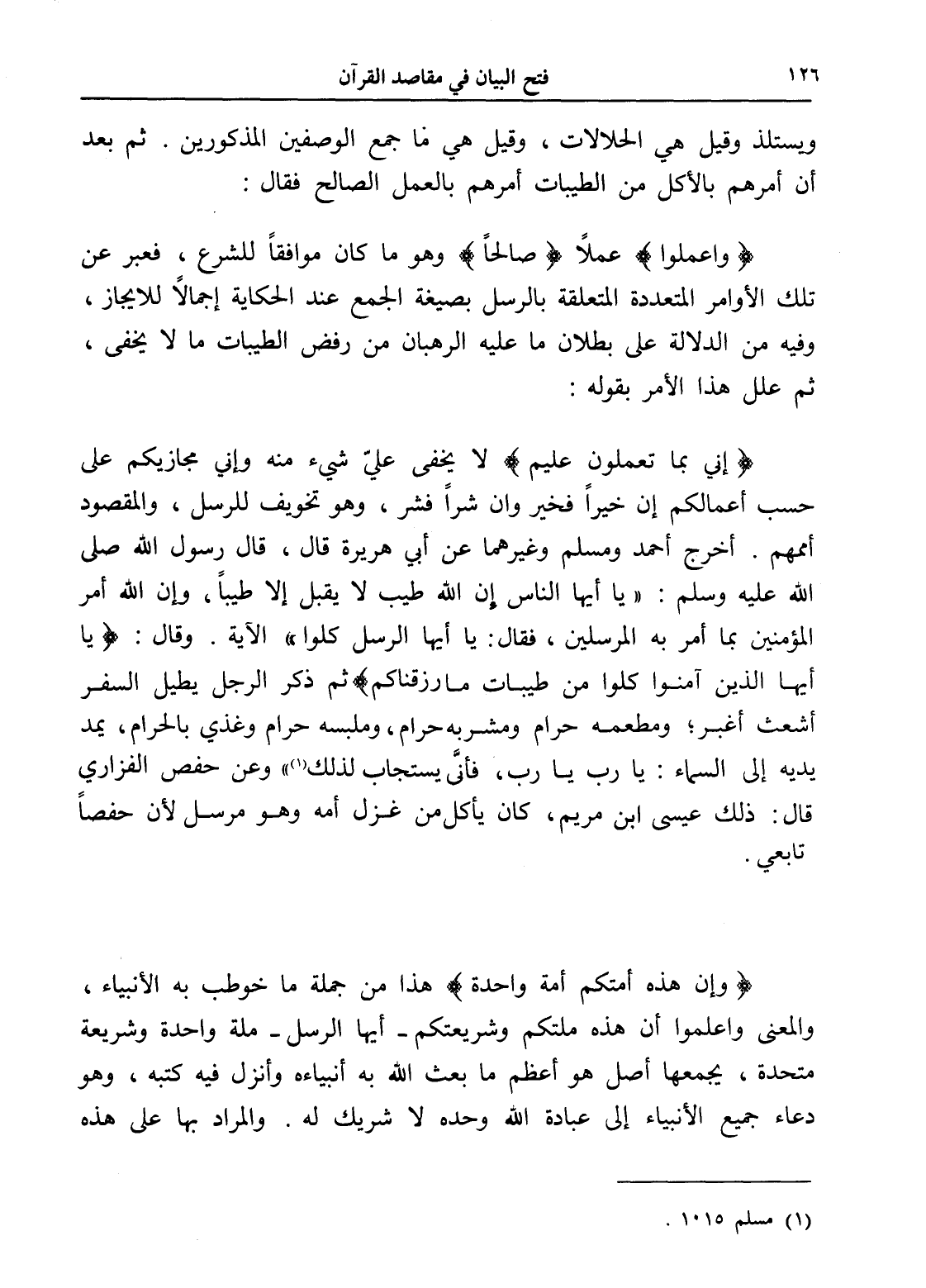 (إني بما تعملون عليم) لا يخفى عليّ شيء منه وإني مجازيكم على حسب أعمالكم إن خيراً فخير وإن شراً فشر، وهو تخويف للرسل، والمقصود أممهم. أخرج أحمد ومسلم وغيرهما عن أبي هريرة قال، قال رسول الله صلى الله عليه وسلم: " يا أيها الناس إن الله طيب لا يقبل إلا طيباً، وإن الله أمر المؤمنين بما أمر به المرسلين، فقال: يا أيها الرسل كلوا " الآية. وقال: (يا أيها الذين آمنوا كلوا من طيبات ما رزقناكم) ثم ذكر الرجل يطيل السفر أشعث أغبر؛ ومطعمه حرام ومشربه حرام، وملبسه حرام وغذي بالحرام، يمد يديه إلى السماء: يا رب يا رب، فأنىَّ يستجاب لذلك (¬1) " وعن حفص الفزاري قال: ذلك عيسى ابن مريم، كان يأكل من غزل أمه وهو مرسل لأن حفصاً تابعي.