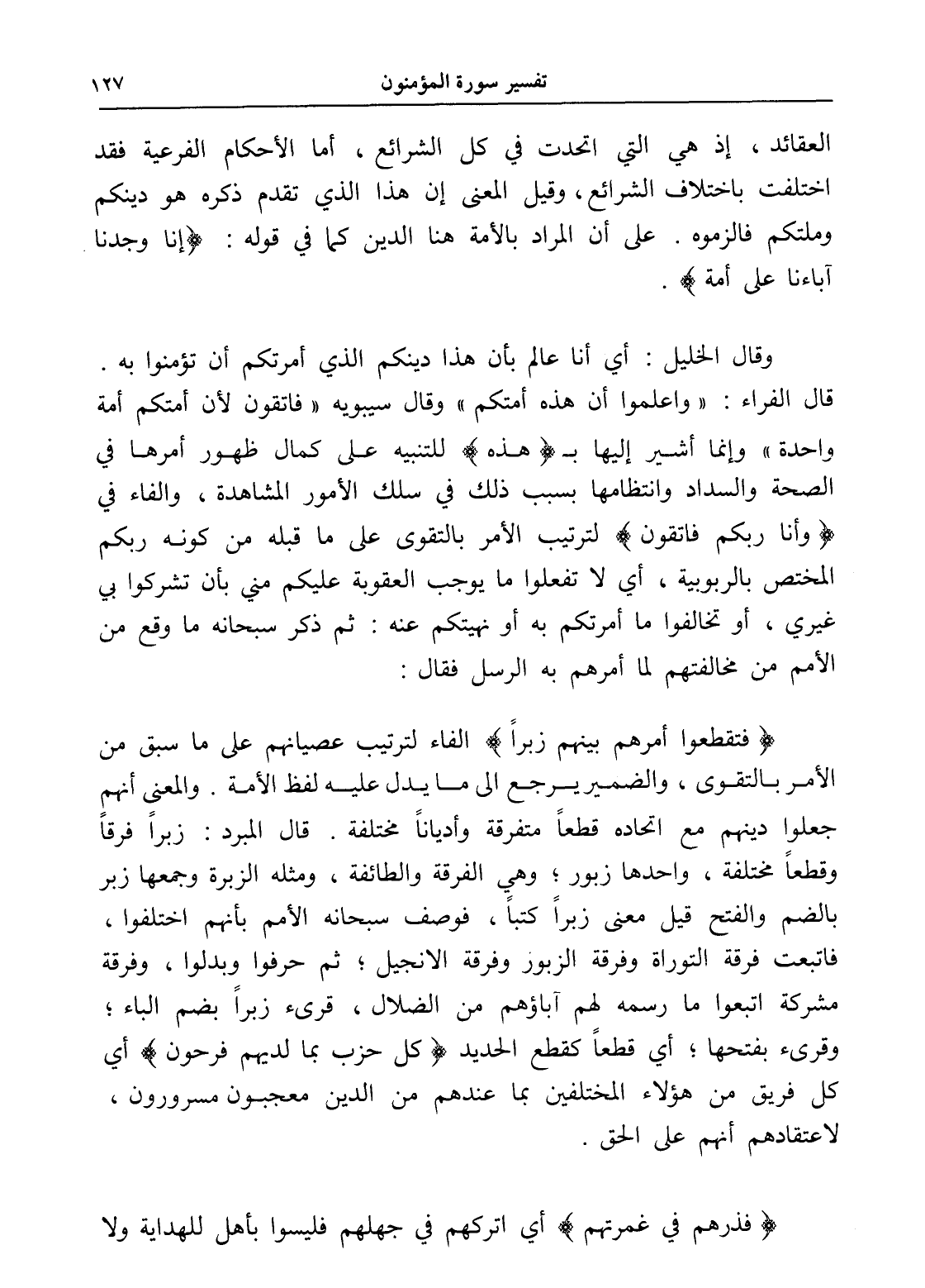 وقال الخليل: أي أنا عالم بأن هذا دينكم الذي أمرتكم أن تؤمنوا به. قال الفراء: " واعلموا أن هذه أمتكم " وقال سيبويه " فاتقون لأن أمتكم أمة واحدة " وإنما أشير إليها بـ (هذه) هذه للتنبيه على كمال ظهور أمرها في الصحة والسداد وانتظامها بسبب ذلك في سلك الأمور المشاهدة، والفاء في (وأنا ربكم فاتقون) لترتيب الأمر بالتقوى على ما قبله من كونه ربكم المختص بالربوبية، أي لا تفعلوا ما يوجب العقوبة عليكم مني بأن تشركوا بي غيري، أو تخالفوا ما أمرتكم به أو نهيتكم عنه: ثم ذكر سبحانه ما وقع من الأمم من مخالفتهم لما أمرهم به الرسل فقال: