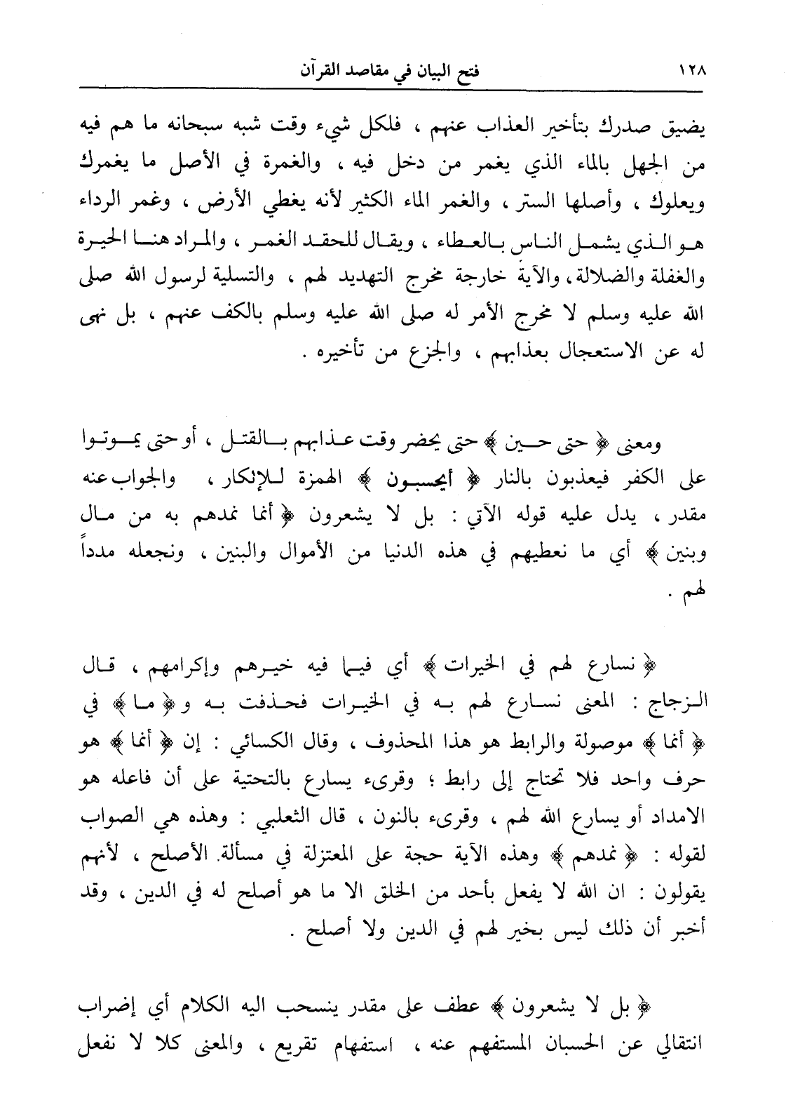 (نسارع لهم في الخيرات) أي فيما فيه خيرهم وإكرامهم، قال الزجاج: المعنى نسارع لهم به في الخيرات فحذفت به و (ما) في (أنما) موصولة والرابط هو هذا المحذوف، وقال الكسائي: إن (أنما) هو حرف واحد فلا تحتاج إلى رابط، وقرئ يسارع بالتحتية على أن فاعله هو الإمداد أو يسارع الله لهم، وقرئ بالنون، قال الثعلبي: وهذه هي الصواب لقوله: (نمدهم) وهذه الآية حجة على المعتزلة في مسألة الأصلح، لأنهم يقولون: إن الله لا يفعل بأحد من الخلق إلا ما هو أصلح له في الدين، وقد أخبر أن ذلك ليس بخير لهم في الدين ولا أصلح.