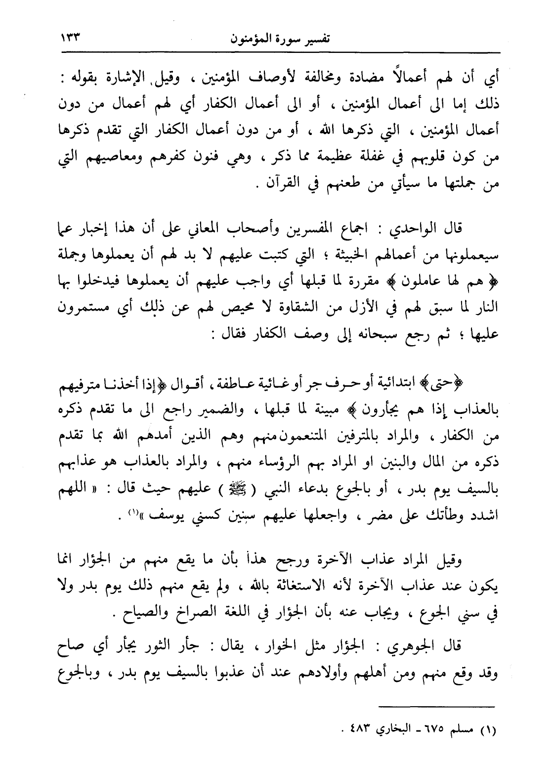 (حتى) ابتدائية أو حرف جر أو غائية عاطفة، أقوال (إذا أخذنا مترفيهم بالعذاب إذا هم يجأرون) مبينة لما قبلها، والضمير راجع إلى ما تقدم ذكره من الكفار، والمراد بالمترفين المتنعمون منهم وهم الذين أمدهم الله بما تقدم ذكره من المال والبنين أو المراد بهم الرؤساء منهم، والمراد بالعذاب هو عذابهم بالسيف يوم بدر، أو بالجوع بدعاء النبي (- صلى الله عليه وسلم -) عليهم حيث قال: " اللهم اشدد وطأتك على مضر، واجعلها عليهم سنين كسني يوسف " (¬1).