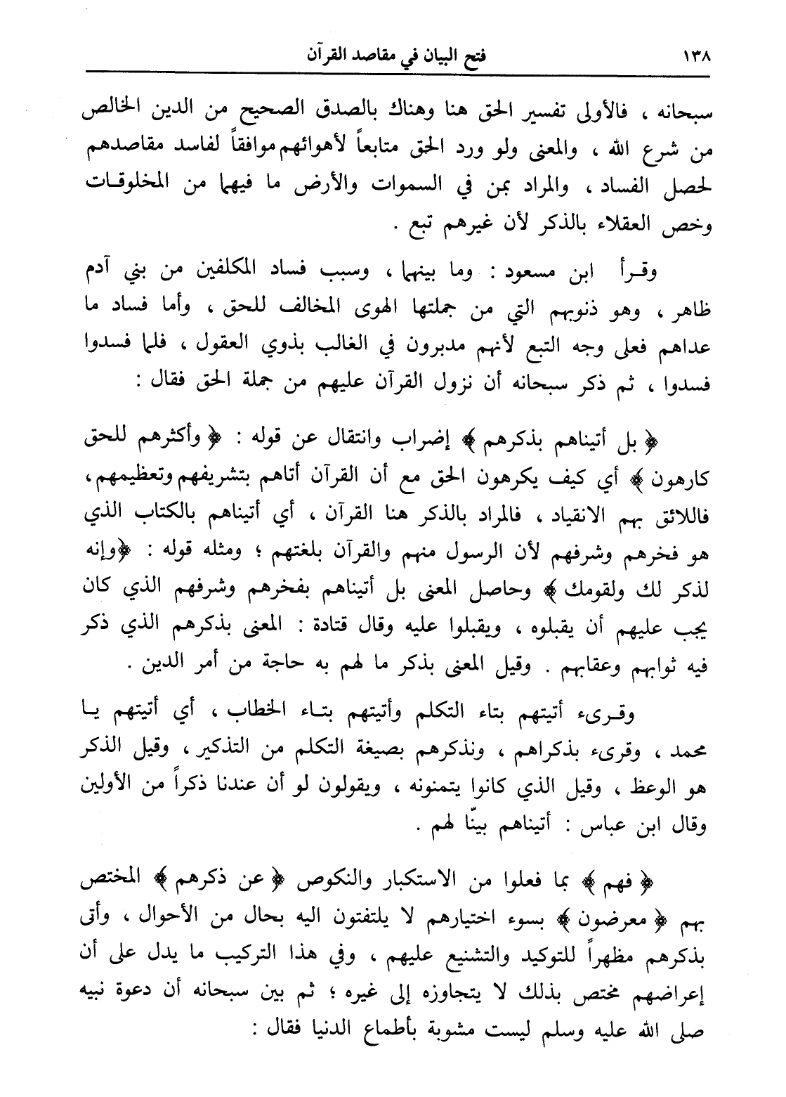 سبحانه، فالأولى تفسير الحق هنا وهناك بالصدق الصحيح من الدين الخالص من شرع الله، والمعنى ولو ورد الحق متابعاً لأهوائهم موافقاً لفاسد مقاصدهم لحصل الفساد، والمراد بمن في السماوات والأرض ما فيهما من المخلوقات وخص العقلاء بالذكر لأن غيرهم تبع.