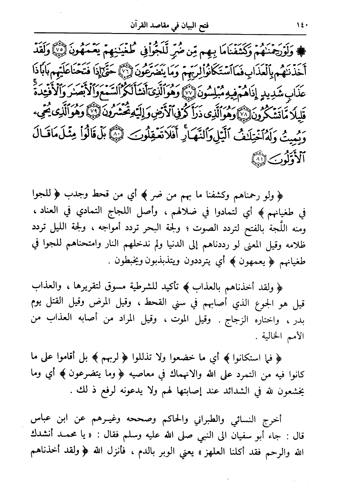 وَلَوْ رَحِمْنَاهُمْ وَكَشَفْنَا مَا بِهِمْ مِنْ ضُرٍّ لَلَجُّوا فِي طُغْيَانِهِمْ يَعْمَهُونَ (75) وَلَقَدْ أَخَذْنَاهُمْ بِالْعَذَابِ فَمَا اسْتَكَانُوا لِرَبِّهِمْ وَمَا يَتَضَرَّعُونَ (76) حَتَّى إِذَا فَتَحْنَا عَلَيْهِمْ بَابًا ذَا عَذَابٍ شَدِيدٍ إِذَا هُمْ فِيهِ مُبْلِسُونَ (77) وَهُوَ الَّذِي أَنْشَأَ لَكُمُ السَّمْعَ وَالْأَبْصَارَ وَالْأَفْئِدَةَ قَلِيلًا مَا تَشْكُرُونَ (78) وَهُوَ الَّذِي ذَرَأَكُمْ فِي الْأَرْضِ وَإِلَيْهِ تُحْشَرُونَ (79) وَهُوَ الَّذِي يُحْيِي وَيُمِيتُ وَلَهُ اخْتِلَافُ اللَّيْلِ وَالنَّهَارِ أَفَلَا تَعْقِلُونَ (80) بَلْ قَالُوا مِثْلَ مَا قَالَ الْأَوَّلُونَ (81)
