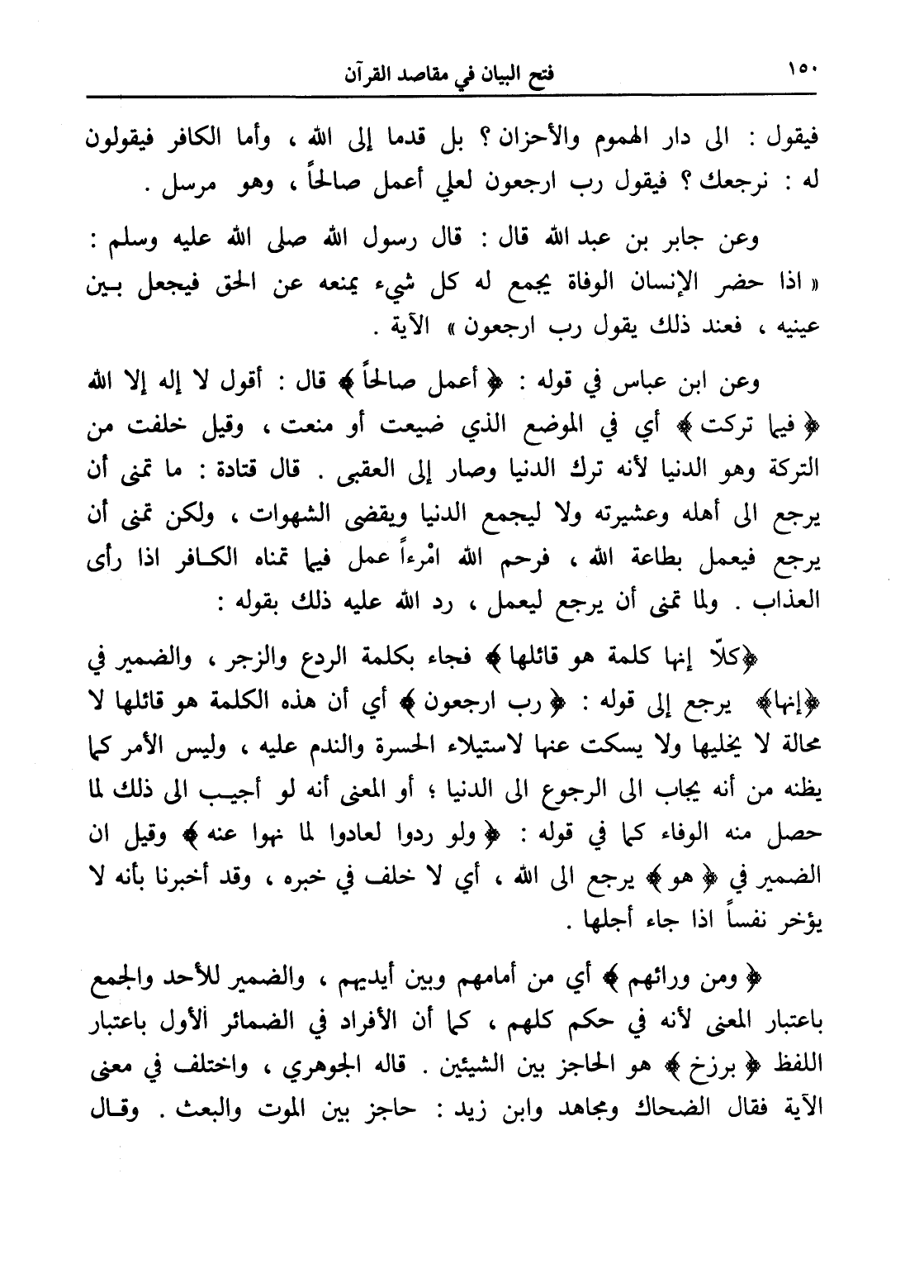 وعن جابر بن عبد الله قال: قال رسول الله صلى الله عليه وسلم: " إذا حضر الإنسان الوفاة يجمع له كل شيء يمنعه عن الحق فيجعل بين عينيه، فعند ذلك يقول رب ارجعون " الآية.