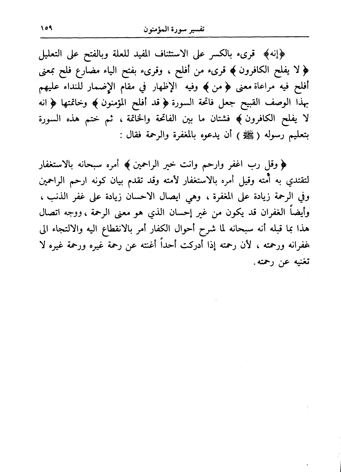 (إنه) قرئ بالكسر على الاستئناف المفيد للعلة وبالفتح على التعليل (لا يفلح الكافرون) قرئ من أفلح، وقرئ بفتح الياء مضارع فلح بمعنى أفلح فيه مراعاة معنى (من) وفيه الإظهار في مقام الإضمار للنداء عليهم بهذا الوصف القبيح جعل فاتحة السورة (قد أفلح المؤمنون) وخاتمتها (إنه لا يفلح الكافرون) فشتان ما بين الفاتحة والخاتمة، ثم ختم هذه السورة بتعليم رسوله (- صلى الله عليه وسلم -) أن يدعوه بالمغفرة والرحمة فقال: