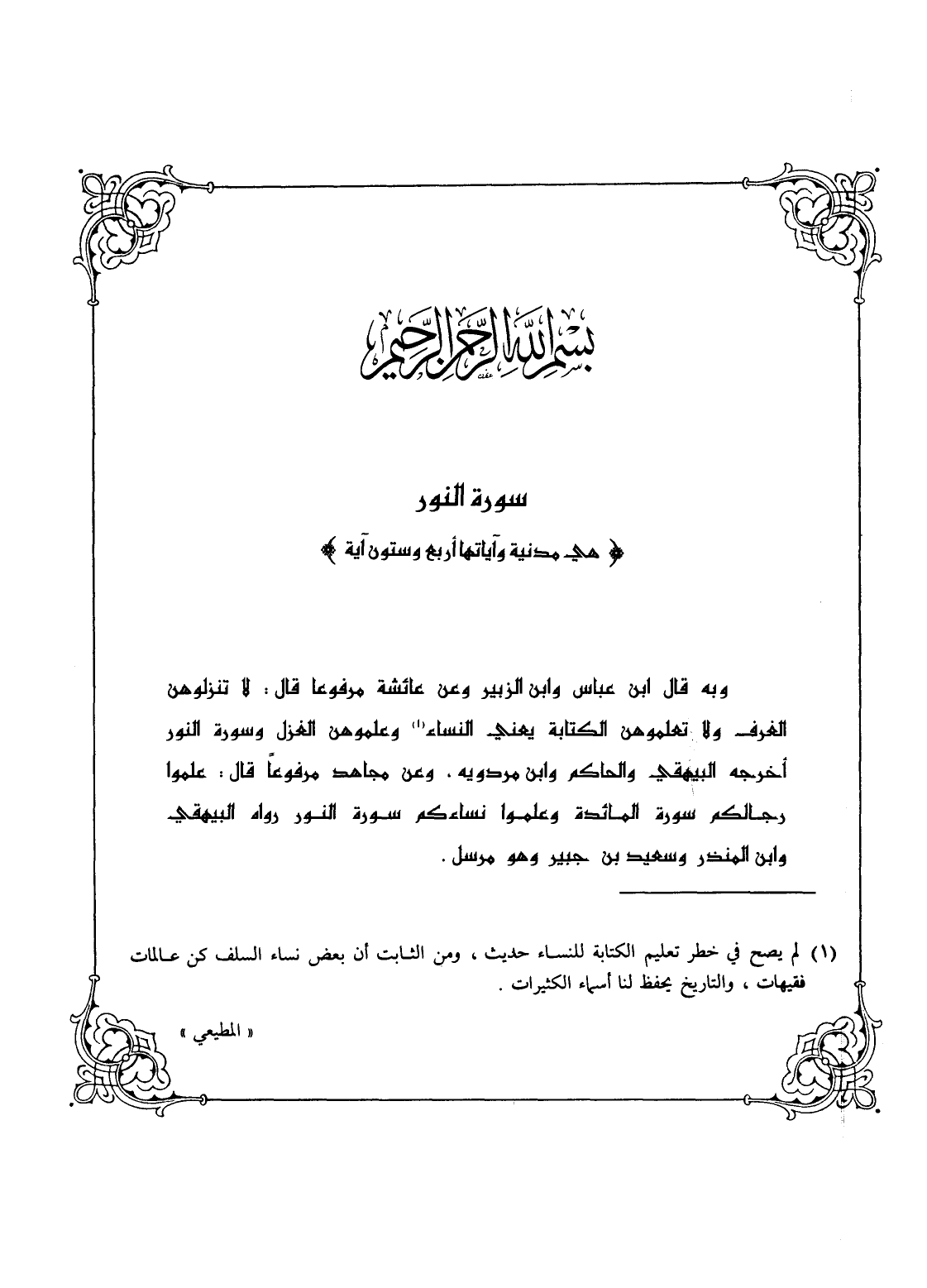 (¬1) لم يصح في خطر تعليم الكتابة للنساء حديث، ومن الثابت أن بعض نساء السلف كن عالمات فقيهات، والتاريخ يحفظ لنا أسماء الكثيرات.