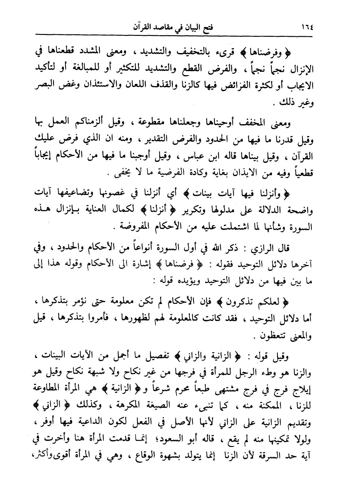 (وفرضناها) قرئ بالتخفيف والتشديد، ومعنى المشدد قطعناها في الإنزال نجماً نجماً، والفرض القطع والتشديد للتكثير أو للمبالغة أو لتأكيد الإيجاب أو لكثرة الفرائض فيها كالزنا والقذف اللعان والاستئذان وغض البصر وغير ذلك.