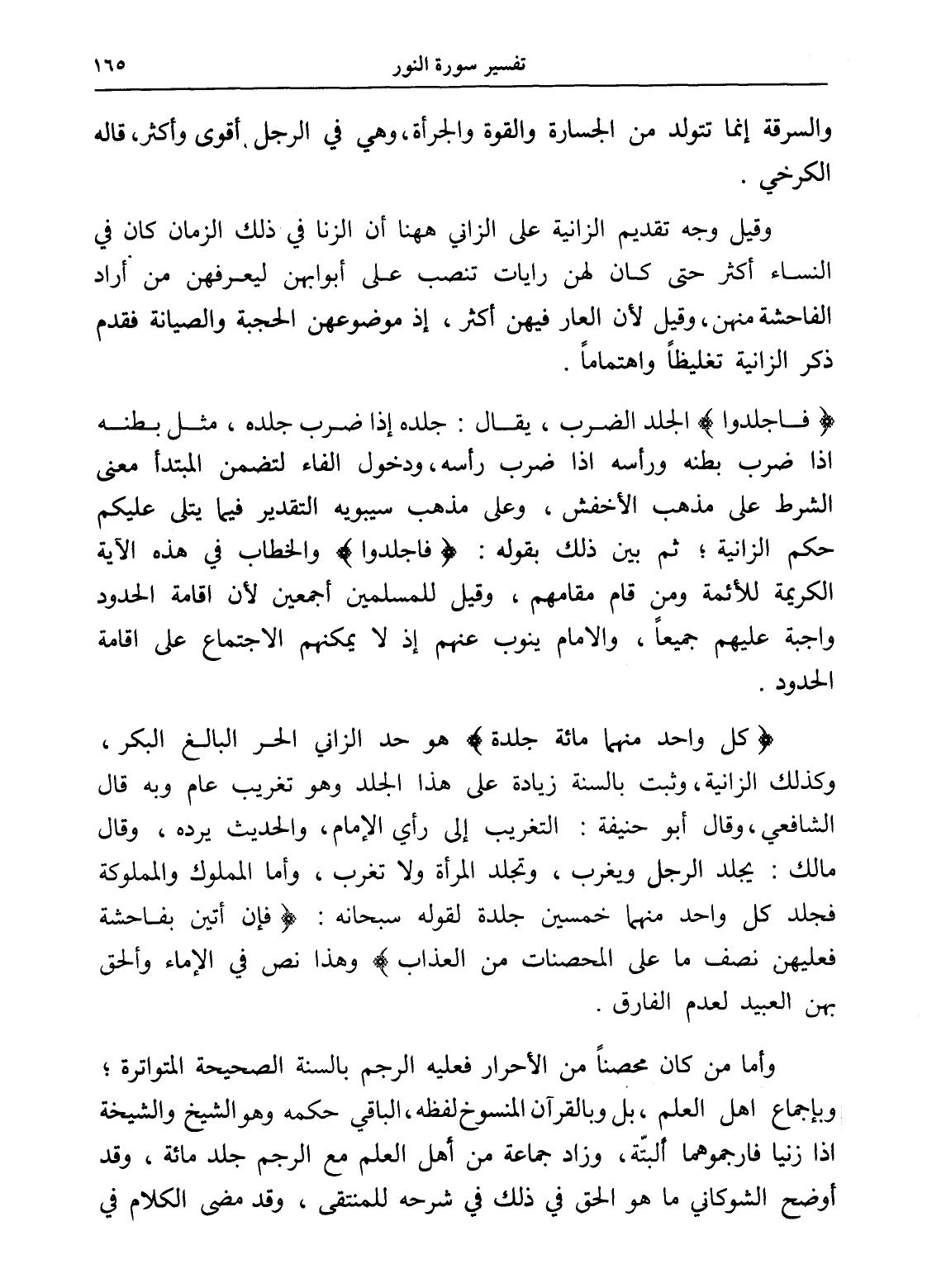 (كل واحد منهما مائة جلدة) هو حد الزاني الحر البالغ البكر، وكذلك الزانية، وثبت بالسنة زيادة على هذا الجلد وهو تغريب عام وبه قال الشافعي، وقال أبو حنيفة: التغريب إلى رأي الإمام، والحديث يرده، وقال مالك: يجلد الرجل ويغرب، وتجلد المرأة ولا تغرب، وأما المملوك والمملوكة فجلد كل واحد منهما خمسين جلدة لقوله سبحانه: (فإن أتين بفاحشة فعليهن نصف ما على المحصنات من العذاب) وهذا نص في الإماء وألحق بهن العبيد لعدم الفارق.