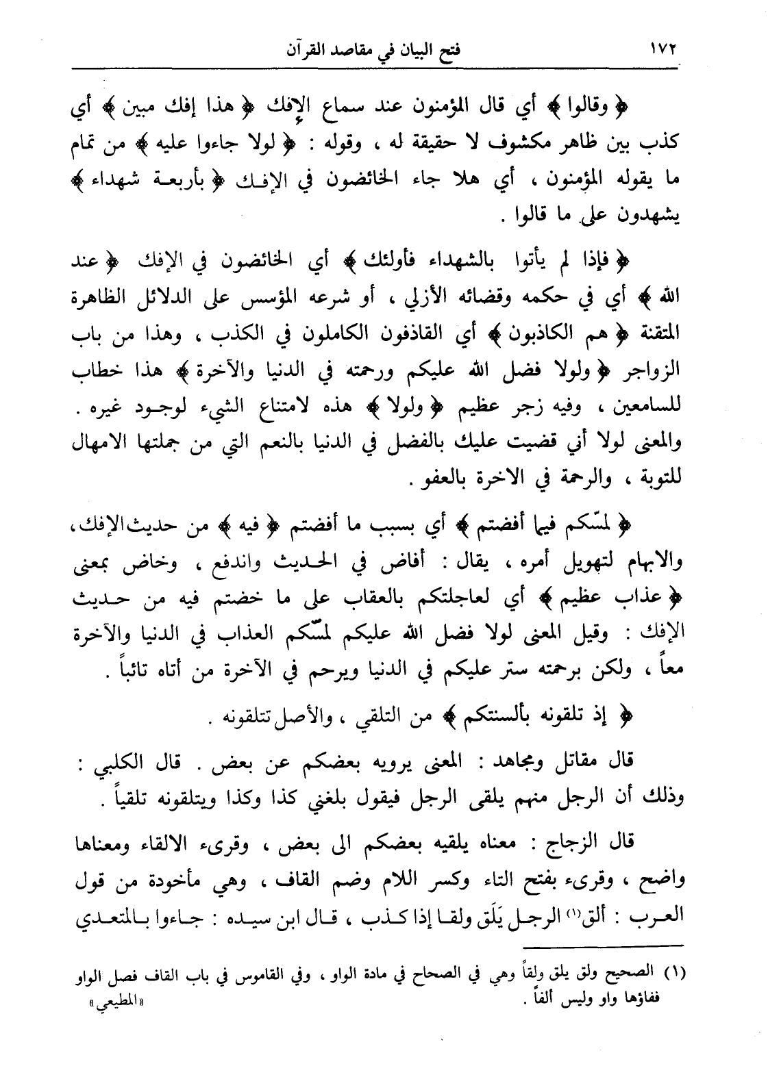 قال الزجاج: معناه يلقيه بعضكم إلى بعض، وقرئ الإلقاء ومعناها واضح، وقرئ بفتح التاء وكسر اللام وضم القاف، وهي مأخودة من قول العرب: ألق (¬1) الرجل يَلَق ولقا إذا كذب، قال ابن سيده: جاءوا بالمتعدي