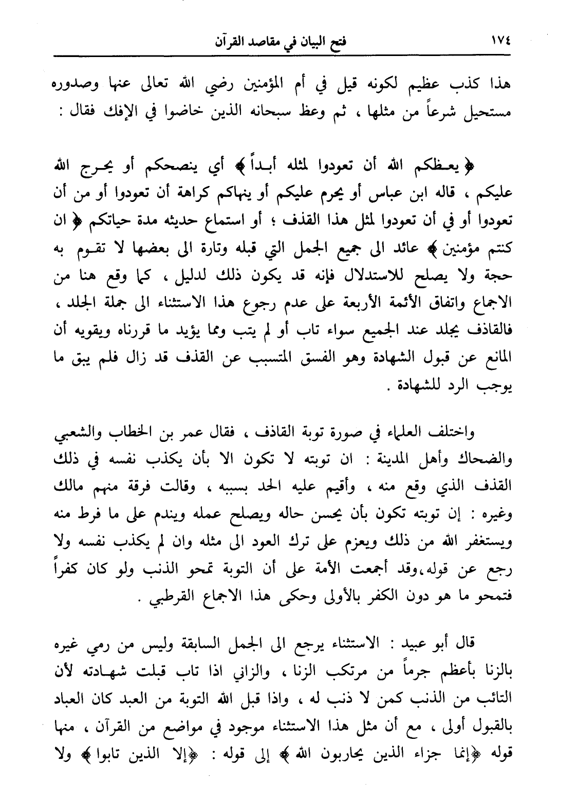 قال أبو عبيد: الاستثناء يرجع إلى الجمل السابقة وليس من رمي غيره بالزنا بأعظم جرماً من مرتكب الزنا، والزاني إذا تاب قبلت شهادته لأن التائب من الذنب كمن لا ذنب له، وإذا قبل الله التوبة من العبد كان العباد بالقبول أولى، مع أن مثل هذا الاستثناء موجود في مواضع من القرآن، منها قوله (إنما جزاء الذين يحاربون الله) إلى قوله: