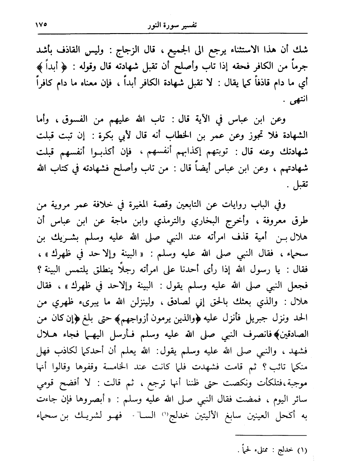 وفي الباب روايات عن التابعين وقصة المغيرة في خلافة عمر مروية من طرق معروفة، وأخرج البخاري والترمذي وابن ماجة عن ابن عباس أن هلال بن أمية قذف امرأته عند النبي صلى الله عليه وسلم بشريك بن سحماء، فقال النبي صلى الله عليه وسلم: " البينة وإلا حد في ظهرك "، فقال: يا رسول الله إذا رأى أحدنا على امرأته رجلاً ينطلق يلتمس البينة؟ فجعل النبي صلى الله عليه وسلم يقول: " البينة وإلا حد في ظهرك "، فقال هلال: والذي بعثك بالحق إني لصادق، ولينزلن الله ما يبرئ ظهري من الحد ونزل جبريل فأنزل عليه