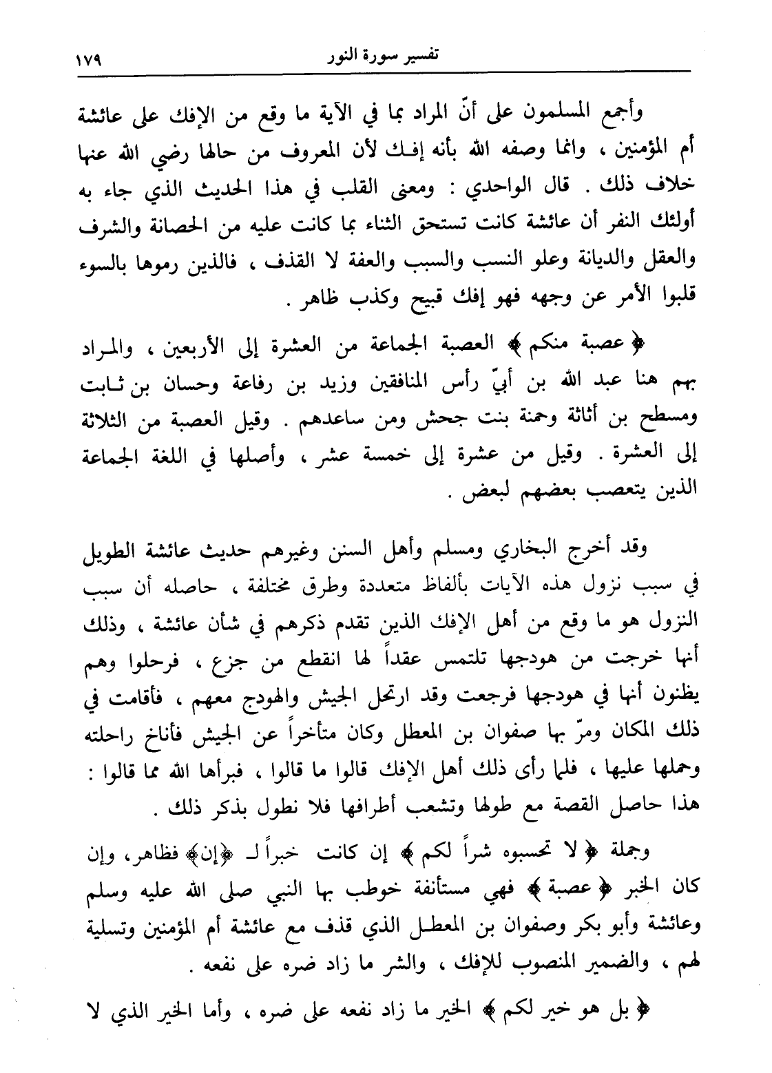 (عصبة منكم) العصبة الجماعة من العشرة إلى الأربعين، والمراد بهم هنا عبد الله بن أبيّ رأس المنافقين وزيد بن رفاعة وحسان بن ثابت ومسطح بن أثاثة وحمنة بنت جحش ومن ساعدهم. وقيل العصبة من الثلاثة إلى العشرة. وقيل من عشرة إلى خمسة عشر، وأصلها في اللغة الجماعة الذين يتعصب بعضهم لبعض.