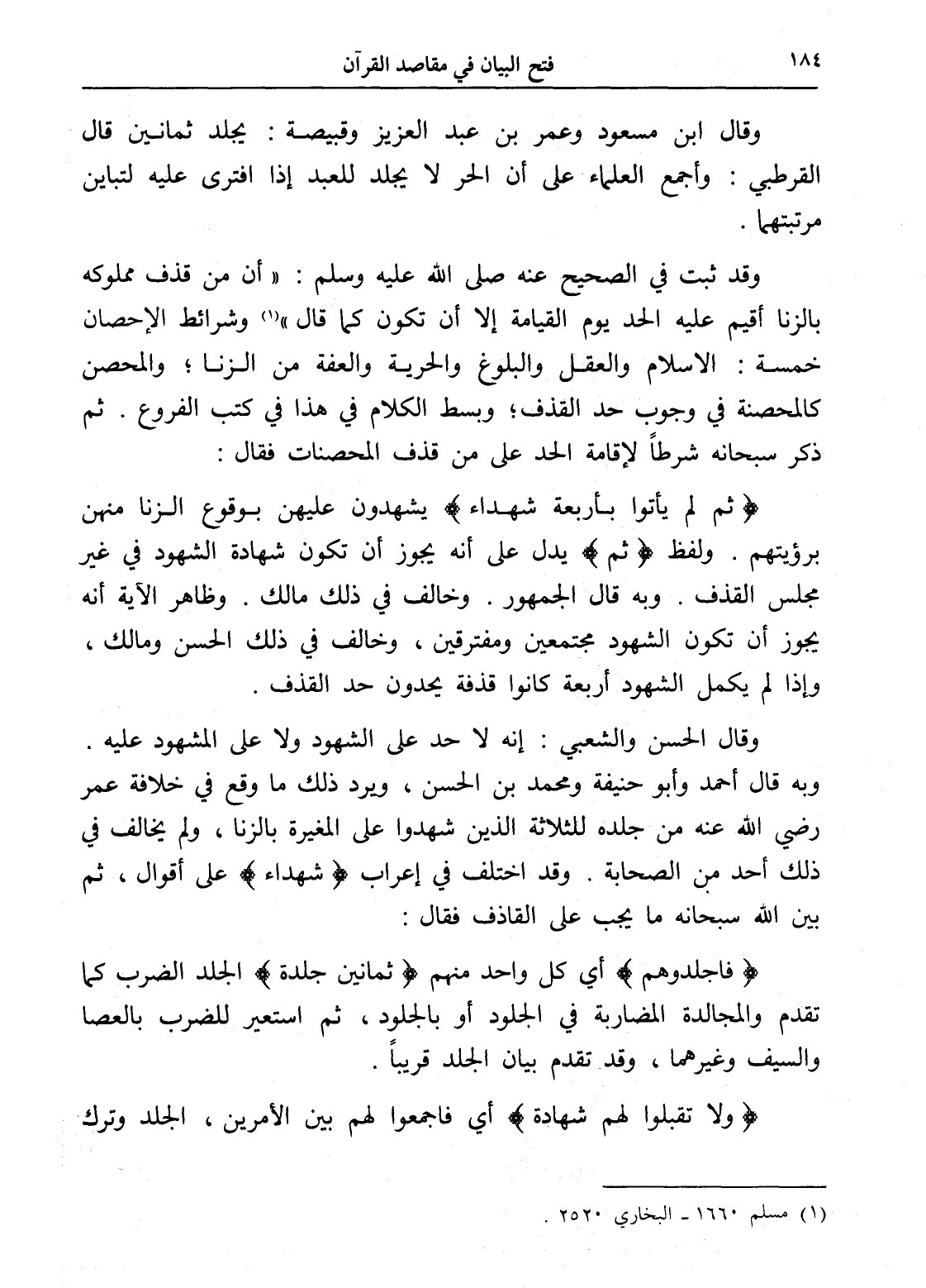 وقد ثبت في الصحيح عنه صلى الله عليه وسلم: " أن من قذف مملوكه بالزنا أقيم عليه الحد يوم القيامة إلا أن تكون كما قال " (¬1) وشرائط الإحصان خمسة: الإسلام والعقل والبلوغ والحرية والعفة من الزنا؛ والمحصن كالمحصنة في وجوب حد القذف؛ وبسط الكلام في هذا في كتب الفروع. ثم ذكر سبحانه شرطاً لإقامة الحد على من قذف المحصنات فقال: