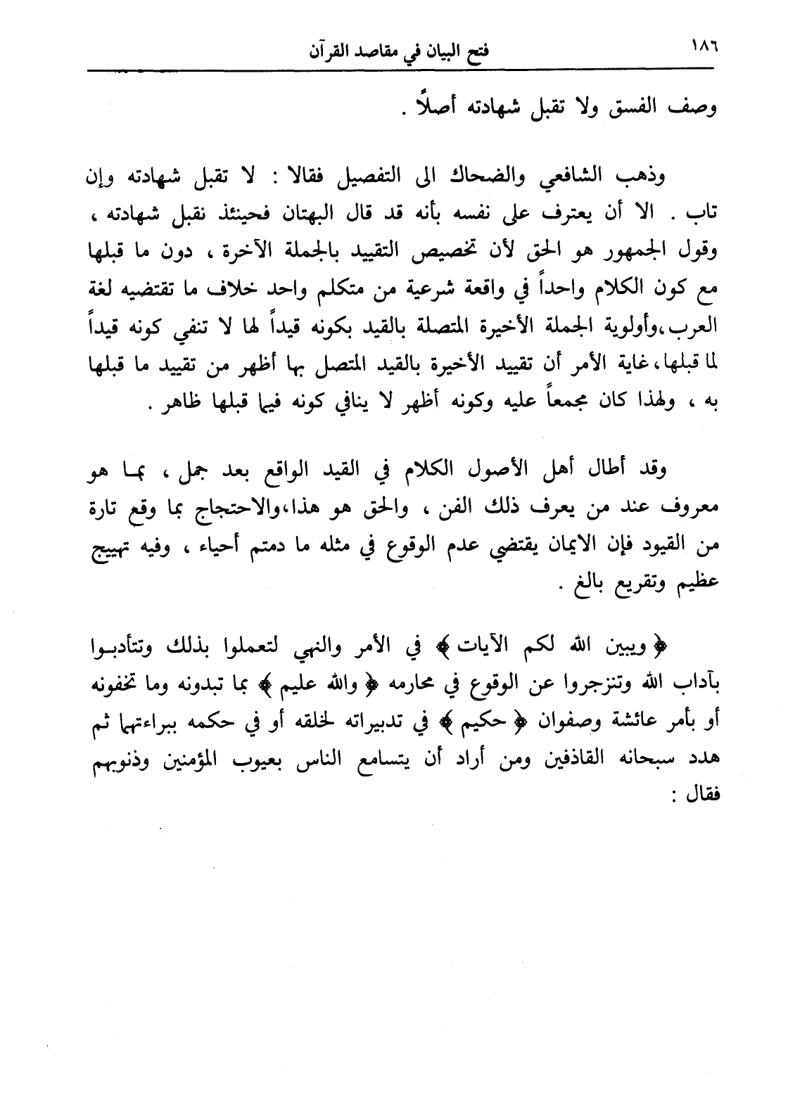 وذهب الشافعي والضحاك إلى التفصيل فقالا: لا تقبل شهادته وإن تاب. إلا أن يعترف على نفسه بأنه قد قال البهتان فحينئذ نقبل شهادته، وقول الجمهور هو الحق لأن تخصيص التقييد بالجملة الآخرة، دون ما قبلها مع كون الكلام واحداً في واقعة شرعية من متكلم واحد خلاف ما تقتضيه لغة العرب، وأولوية الجملة الأخيرة المتصلة بالقيد بكونه قيداً لها لا تنفي كونه قيداً لا قبلها، غاية الأمر أن تقييد الأخيرة بالقيد المتصل بها أظهر من تقييد ما قبلها به، ولهذا كان مجمعاً عليه وكونه أظهر لا ينافي كونه فيما قبلها ظاهر.