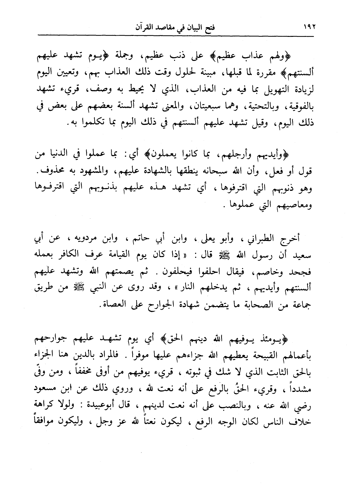 (يوم تشهد عليهم ألسنتهم) مقررة لما قبلها، مبينة لحلول وقت ذلك العذاب بهم، وتعيين اليوم لزيادة التهويل بما فيه من العذاب، الذي لا يحيط به وصف، قرئ تشهد بالفوقية، وبالتحتية، وهما سبعيتان، والمعنى تشهد ألسنة بعضهم على بعض في ذلك اليوم، وقيل تشهد عليهم ألسنتهم في ذلك اليوم بما تكلموا به.