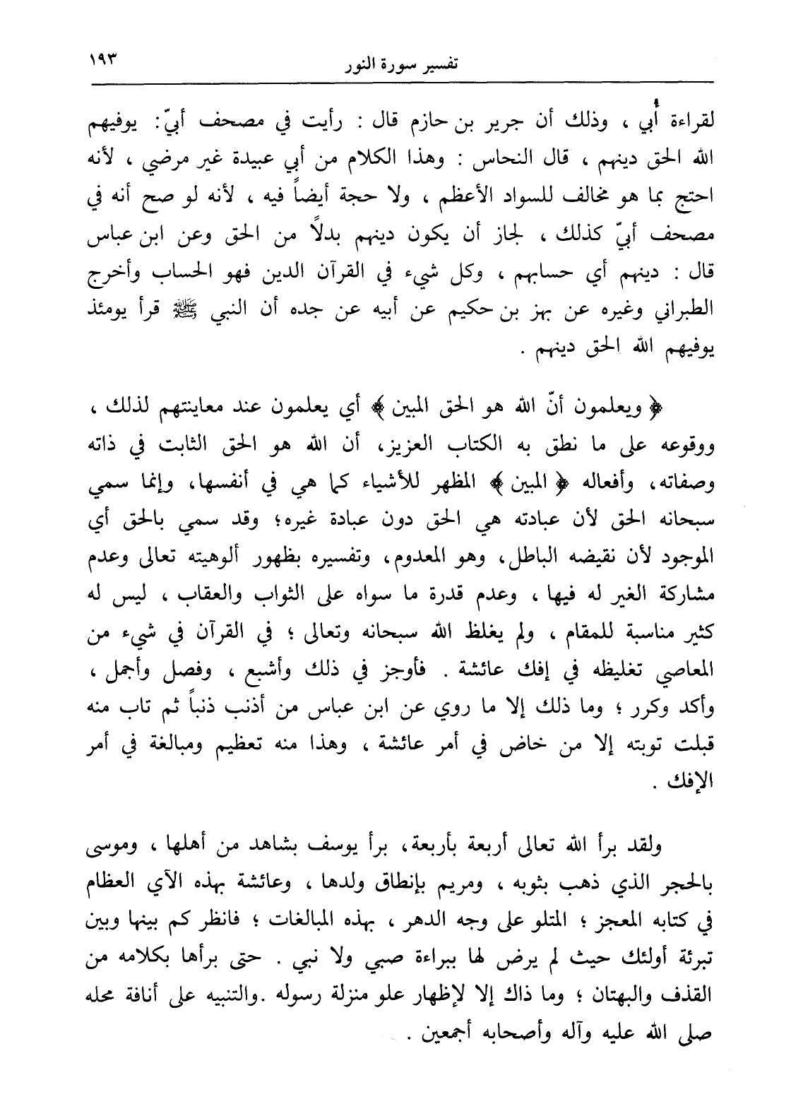 لقراءة أُبي، وذلك أن جرير بن حازم قال: رأيت في مصحف أبيّ: يوفيهم الله الحق دينهم، قال النحاس: وهذا الكلام من أبي عبيدة غير مرضي، لأنه احتج بما هو مخالف للسواد الأعظم، ولا حجة أيضاً فيه، لأنه لو صح أنه في مصحف أبيّ كذلك، لجاز أن يكون دينهم بدلاً من الحق وعن ابن عباس قال: دينهم أي حسابهم، وكل شيء في القرآن الدين فهو الحساب وأخرج الطبراني وغيره عن بهز بن حكيم عن أبيه عن جده أن النبي - صلى الله عليه وسلم - قرأ يومئذ يوفيهم الله الحق دينهم.