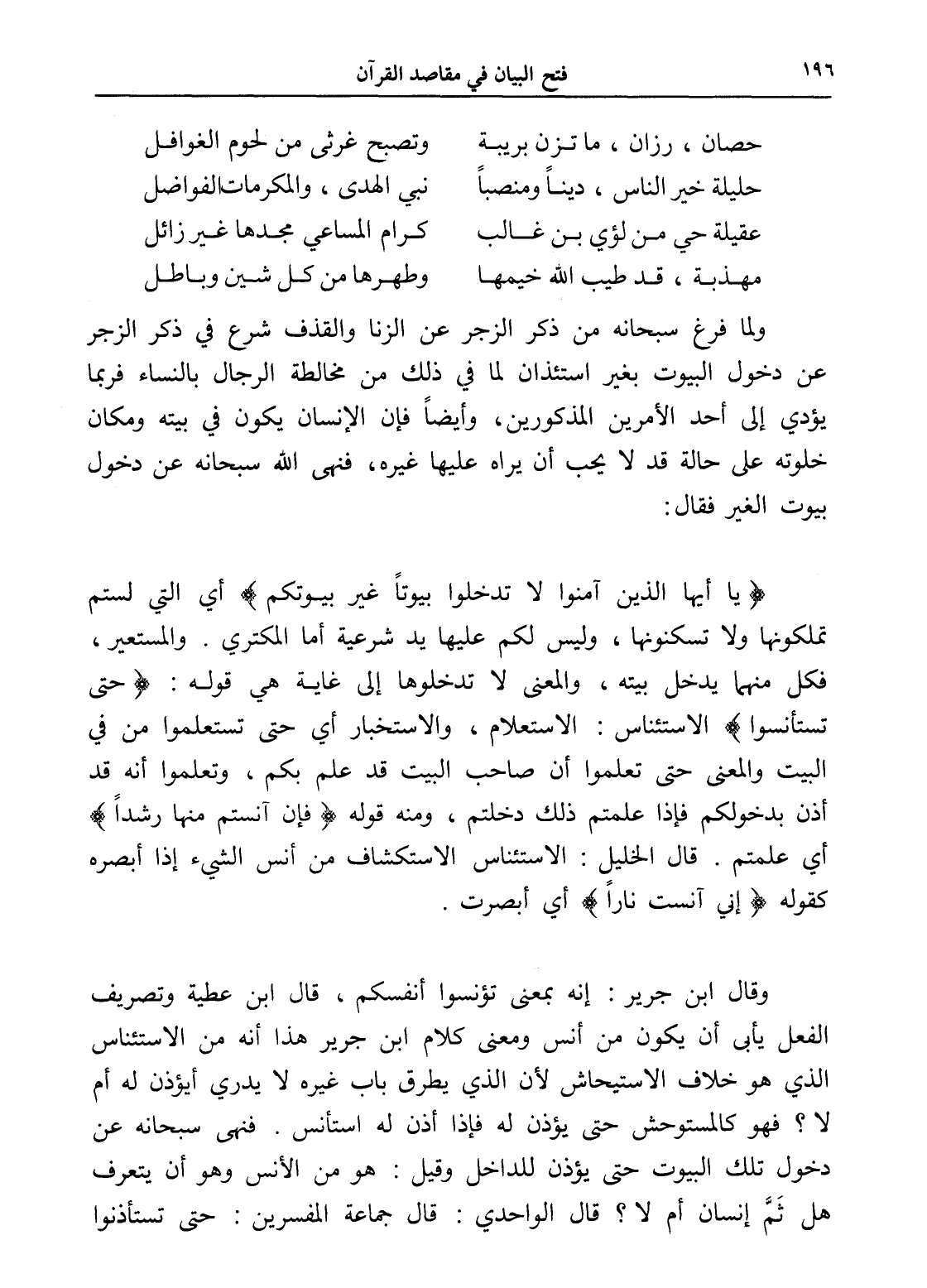 ولما فرغ سبحانه من ذكر الزجر عن الزنا والقذف شرع في ذكر الزجر عن دخول البيوت بغير استئذان لما في ذلك من مخالطة الرجال بالنساء فربما يؤدي إلى أحد الأمرين المذكورين، وأيضاً فإن الإنسان يكون في بيته ومكان خلوته على حالة قد لا يحب أن يراه عليها غيره، فنهى الله سبحانه عن دخول بيوت الغير فقال: