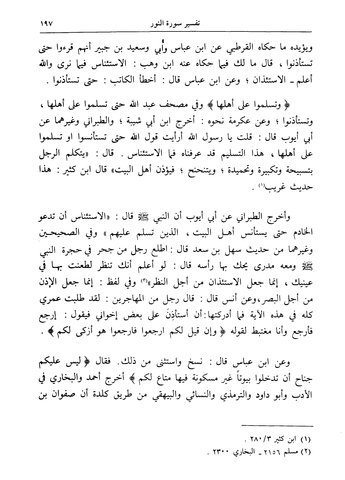 وعن ابن عباس قال: نسخ واستثنى من ذلك. فقال (ليس عليكم جناح أن تدخلوا بيوتاً غير مسكونة فيها متاع لكم) أخرج أحمد والبخاري في الأدب وأبو داود والترمذي والنسائي والبيهقي من طريق كلدة أن صفوان بن