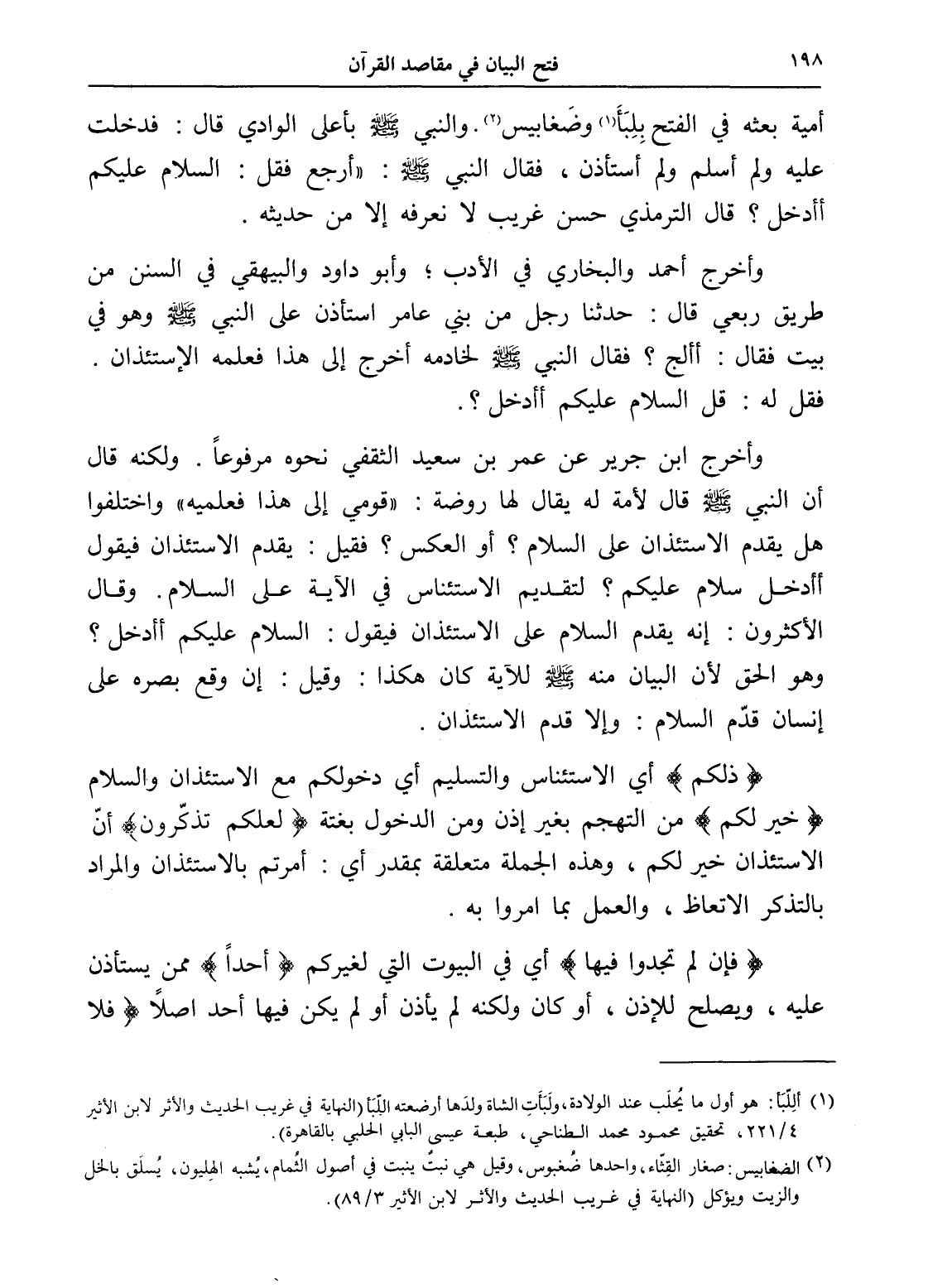 وأخرج ابن جرير عن عمر بن سعيد الثقفي نحوه مرفوعاً. ولكنه قال أن النبي - صلى الله عليه وسلم - قال لأمة له يقال لها روضة: " قومي إلى هذا فعلميه " واختلفوا هل يقدم الاستئذان على السلام؟ أو العكس؟ فقيل: يقدم الاستئذان فيقول أأدخل سلام عليكم؟ لتقديم الاستئناس في الآية على السلام. وقال الأكثرون: إنه يقدم السلام على الاستئذان فيقول: السلام عليكم أأدخل؟ وهو الحق لأن البيان منه - صلى الله عليه وسلم - للآية كان هكذا: وقيل: إن وقع بصره على إنسان قدّم السلام: وإلا قدم الاستئذان.