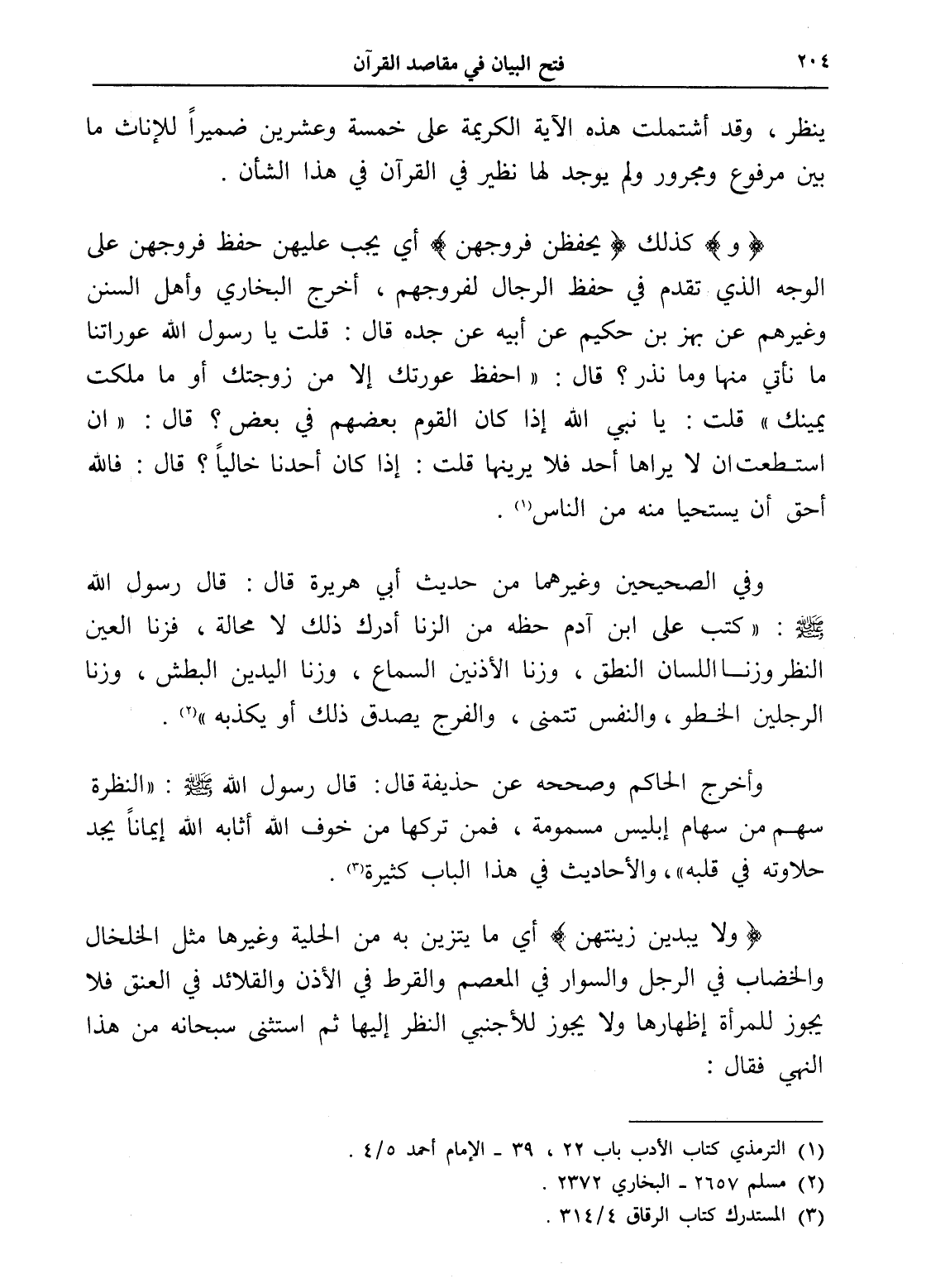 (و) كذلك (يحفظن فروجهن) أي يجب عليهن حفظ فروجهن على الوجه الذي تقدم في حفظ الرجال لفروجهم، أخرج البخاري وأهل السنن وغيرهم عن بهز بن حكيم عن أبيه عن جده قال: قلت يا رسول الله عوراتنا ما نأتي منها وما نذر؟ قال: " احفظ عورتك إلا من زوجتك أو ما ملكت يمينك " قلت: يا نبي الله إذا كان القوم بعضهم في بعض؟ قال: " إن استطعت أن لا يراها أحد فلا يرينها قلت: إذا كان أحدنا خالياً؟ قال: فالله أحق أن يستحيا منه من الناس " (¬1).