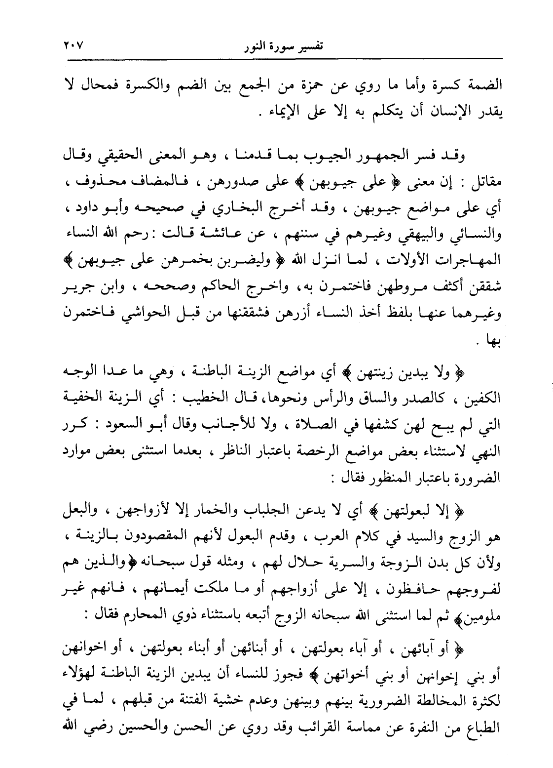 (أَوْ آبَائِهِنَّ أَوْ آبَاءِ بُعُولَتِهِنَّ أَوْ أَبْنَائِهِنَّ أَوْ أَبْنَاءِ بُعُولَتِهِنَّ أَوْ إِخْوَانِهِنَّ أَوْ بَنِي إِخْوَانِهِنَّ أَوْ بَنِي أَخَوَاتِهِنَّ) فجوز للنساء أن يبدين الزينة الباطنة لهؤلاء لكثرة المخالطة الضرورية بينهم وبينهن وعدم خشية الفتنة من قبلهم، لما في الطباع من النفرة عن مماسة القرائب وقد روي عن الحسن والحسين رضي الله