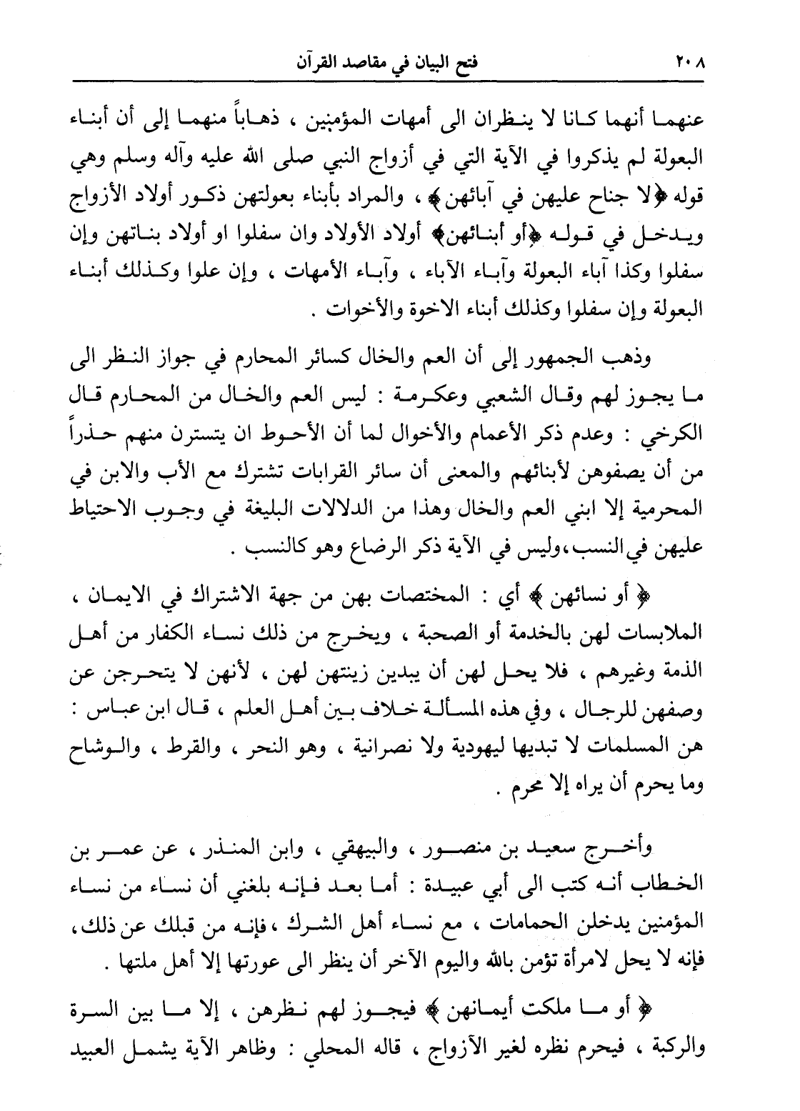 عنهما أنهما كانا لا ينظران إلى أمهات المؤمنين، ذهاباً منهما إلى أن أبناء البعولة لم يذكروا في الآية التي في أزواج النبي صلى الله عليه وآله وسلم وهي قوله (لا جناح عليهن في آبائهن)، والمراد بأبناء بعولتهن ذكور أولاد الأزواج ويدخل في قوله (أو أبنائهن) أولاد الأولاد وإن سفلوا أو أولاد بناتهن وإن سفلوا وكذا آباء البعولة وآباء الآباء، وآباء الأمهات، وإن علوا وكذلك أبناء البعولة وإن سفلوا وكذلك أبناء الإخوة والأخوات.