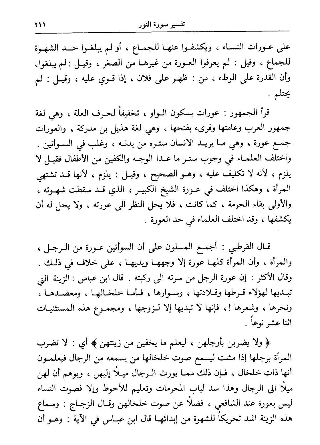 قال القرطبي: أجمع المسلمون على أن السوأتين عورة من الرجل، والمرأة، وأن المرأة كلها عورة إلا وجهها ويديها، على خلاف في ذلك. وقال الأكثر: إن عورة الرجل من سرته إلى ركبته. قال ابن عباس: الزينة التي تبديها لهؤلاء قرطها وقلادتها، وسوارها، فأما خلخالها، ومعضدها، ونحرها، وشعرها!، فإنها لا تبديها إلا لزوجها، ومجموع هذه المستثنيات اثنا عشر نوعاً.