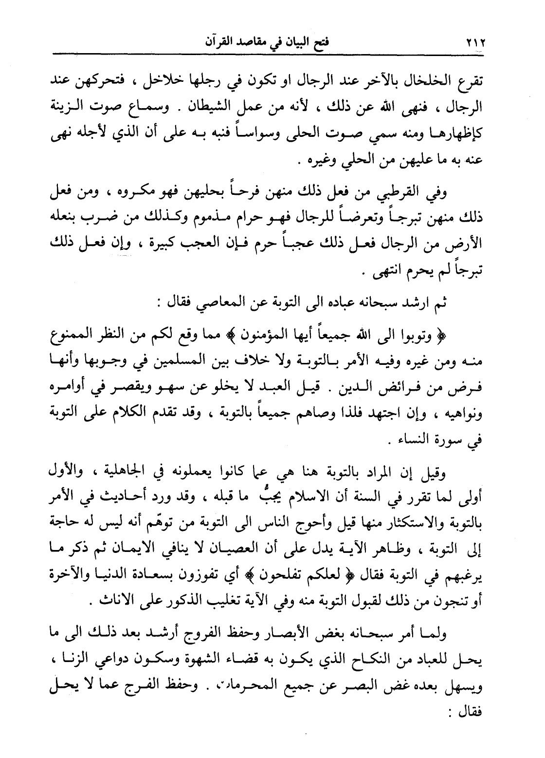 وقيل إن المراد بالتوبة هنا هي عما كانوا يعملونه في الجاهلية، والأول أولى لما تقرر في السنة أن الإسلام يجبُّ ما قبله، وقد ورد أحاديث في الأمر بالتوبة والاستكثار منها قيل وأحوج الناس إلى التوبة من توهّم أنه ليس له حاجة إلى التوبة، وظاهر الآية يدل على أن العصيان لا ينافي الإيمان ثم ذكر ما يرغبهم في التوبة فقال (لعلكم تفلحون) أي تفوزون بسعادة الدنيا والآخرة أو تنجون من ذلك لقبول التوبة منه وفي الآية تغليب المذكور على الإناث.