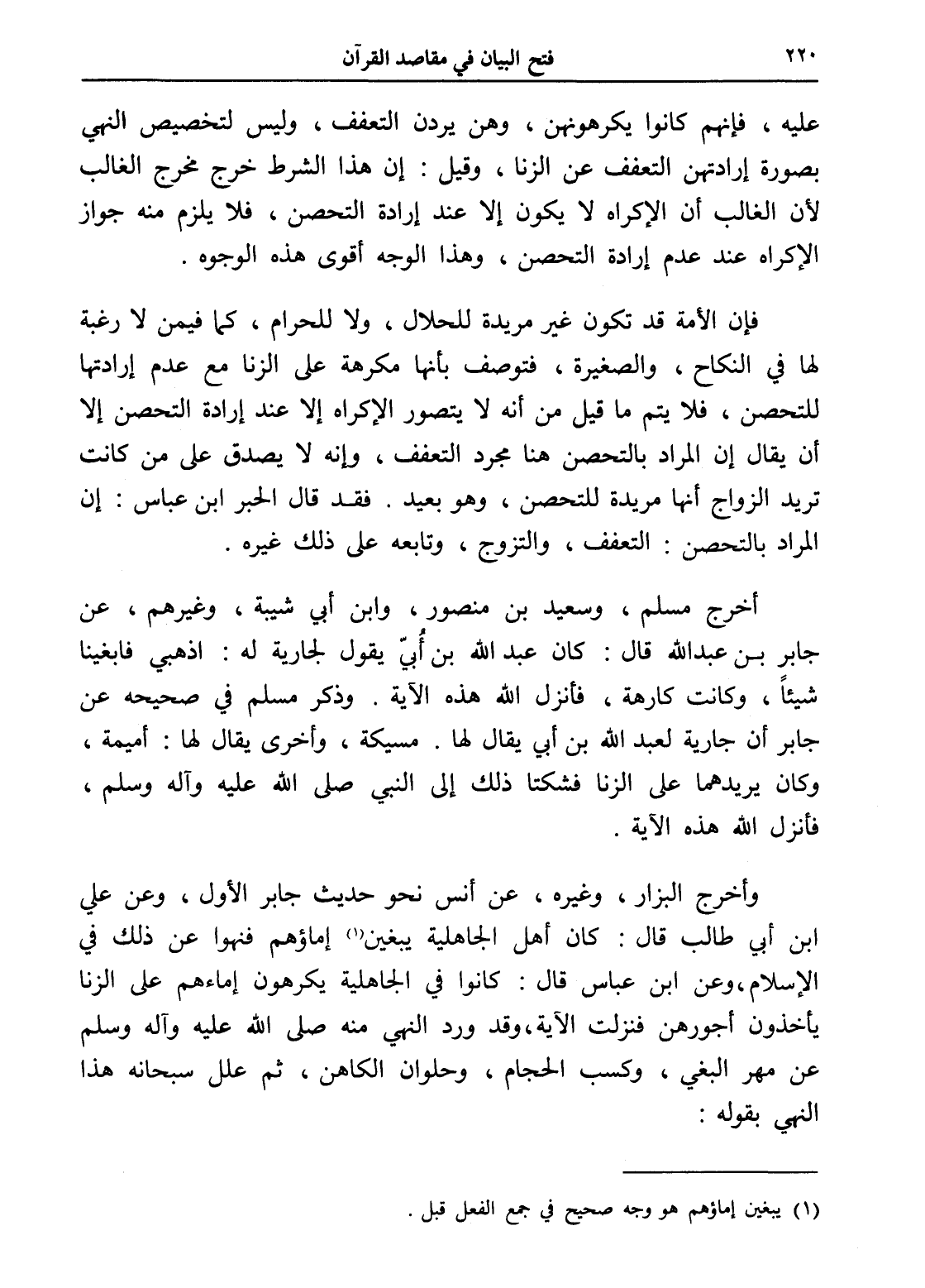 فإن الأمة قد تكون غير مريدة للحلال، ولا للحرام، كما فيمن لا رغبة لها في النكاح، والصغيرة، فتوصف بأنها مكرهة على الزنا مع عدم إرادتها للتحصن، فلا يتم ما قيل من أنه لا يتصور الإكراه إلا عند إرادة التحصن إلا أن يقال إن المراد بالتحصن هنا مجرد التعفف، وإنه لا يصدق على من كانت تريد الزواج أنها مريدة للتحصن، وهو بعيد. فقد قال الحبر ابن عباس: إن المراد بالتحصن: التعفف، والتزوج، وتابعه على ذلك غيره.