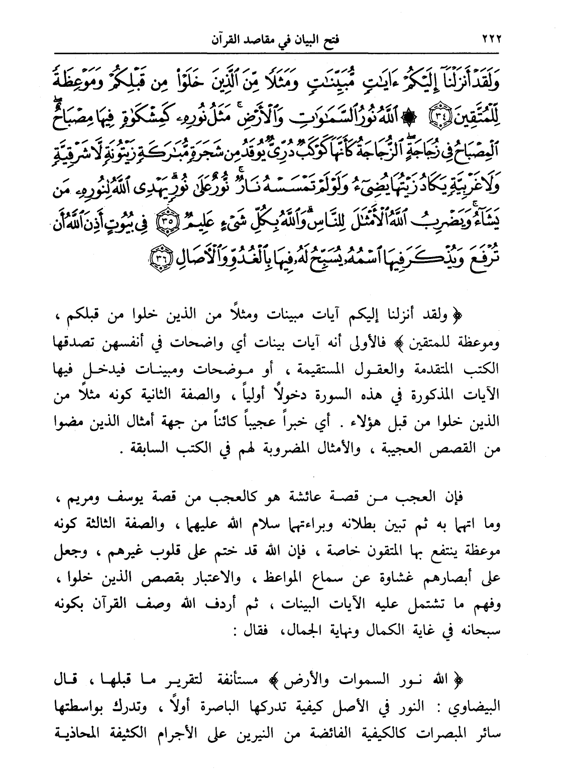 وَلَقَدْ أَنْزَلْنَا إِلَيْكُمْ آيَاتٍ مُبَيِّنَاتٍ وَمَثَلًا مِنَ الَّذِينَ خَلَوْا مِنْ قَبْلِكُمْ وَمَوْعِظَةً لِلْمُتَّقِينَ (34) اللَّهُ نُورُ السَّمَاوَاتِ وَالْأَرْضِ مَثَلُ نُورِهِ كَمِشْكَاةٍ فِيهَا مِصْبَاحٌ الْمِصْبَاحُ فِي زُجَاجَةٍ الزُّجَاجَةُ كَأَنَّهَا كَوْكَبٌ دُرِّيٌّ يُوقَدُ مِنْ شَجَرَةٍ مُبَارَكَةٍ زَيْتُونَةٍ لَا شَرْقِيَّةٍ وَلَا غَرْبِيَّةٍ يَكَادُ زَيْتُهَا يُضِيءُ وَلَوْ لَمْ تَمْسَسْهُ نَارٌ نُورٌ عَلَى نُورٍ يَهْدِي اللَّهُ لِنُورِهِ مَنْ يَشَاءُ وَيَضْرِبُ اللَّهُ الْأَمْثَالَ لِلنَّاسِ وَاللَّهُ بِكُلِّ شَيْءٍ عَلِيمٌ (35) فِي بُيُوتٍ أَذِنَ اللَّهُ أَنْ تُرْفَعَ وَيُذْكَرَ فِيهَا اسْمُهُ يُسَبِّحُ لَهُ فِيهَا بِالْغُدُوِّ وَالْآصَالِ (36)