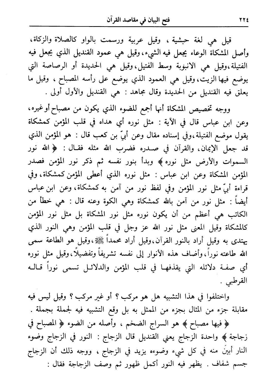 ووجه تخصيص المشكاة أنها أجمع للضوء الذي يكون من مصباح أو غيره، وعن ابن عباس قال في الآية: مثل نوره أي هداه في قلب المؤمن كمشكاة يقول موضع الفتيلة، وفي إسناده مقال وعن أبيّ بن كعب قال: هو المؤمن الذي قد جعل الإيمان، والقرآن في صدره فضرب الله مثله فقال: (الله نور السماوات والأرض مثل نوره) وبدأ بنور نفسه ثم ذكر نور المؤمن فصدر المؤمن المشكاة وعن ابن عباس: مثل نوره الذي أعطى المؤمن كمشكاة، وفي قراءة أبيّ مثل نور المؤمن وفي لفظ نور من آمن به كمشكاة، وعن ابن عباس أيضاً: مثل نور من آمن بالله كمشكاة وهي الكوة وعنه قال: هي خطأ من الكاتب هي أعظم من أن يكون نوره مثل نور المشكاة بل مثل نور المؤمن كالمشكاة وقيل المعنى مثل نور الله عز وجل في قلب المؤمن وهي النور الذي يهتدى به وقيل أراد بالنور القرآن، وقيل أراد محمداً - صلى الله عليه وسلم -، وقيل هو الطاعة سمى الله طاعته نوراً، وأضاف هذه الأنوار إلى نفسه تشريفاً وتفضيلاً، وقيل مثل نوره أي صفة دلائله التي يقذفها في قلب المؤمن والدلائل تسمى نوراً قاله القرطبي.