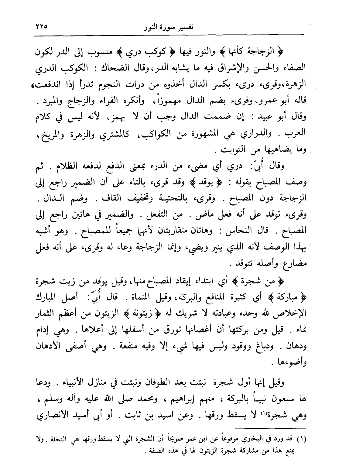 (¬1) قد ورد في البخاري مرفوعاً عن ابن عمر صريحاً أن الشجرة التي لا يسقط ورقها هي النخلة. ولا يمنع هذا من مشاركة شجرة الزيتون لها في هذه الصفة.