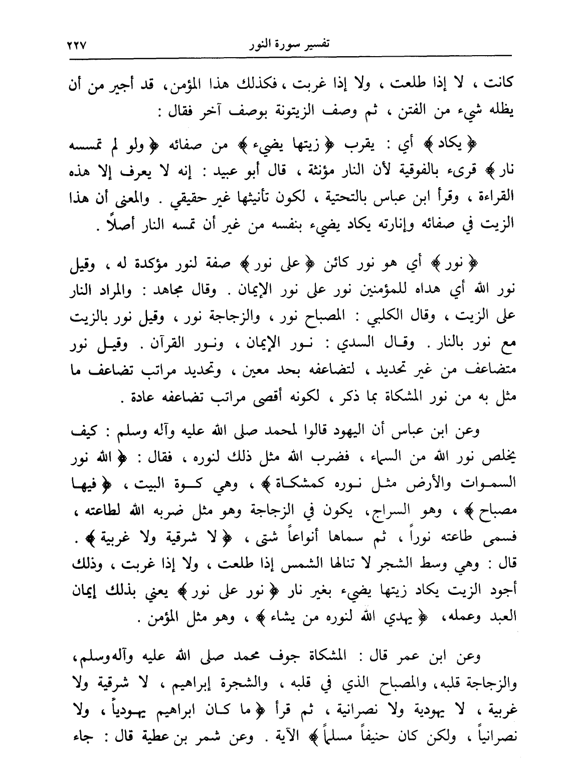 وعن ابن عباس أن اليهود قالوا لمحمد صلى الله عليه وآله وسلم: كيف يخلص نور الله من السماء، فضرب الله مثل ذلك لنوره، فقال: (الله نور السماوات والأرض مثل نوره كمشكاة)، وهي كوة البيت، (فيها مصباح)، وهو السراج، يكون في الزجاجة وهو مثل ضربه الله لطاعته، فسمى طاعته نوراً، ثم سماها أنواعاً شتى، (لا شرقية ولا غربية). قال: وهي وسط الشجر لا تنالها الشمس إذا طلعت، ولا إذا غربت، وذلك أجود الزيت يكاد زيتها يضيء بغير نار (نور على نور) يعني بذلك إيمان العبد وعمله، (يهدي الله لنوره من يشاء)، وهو مثل المؤمن.