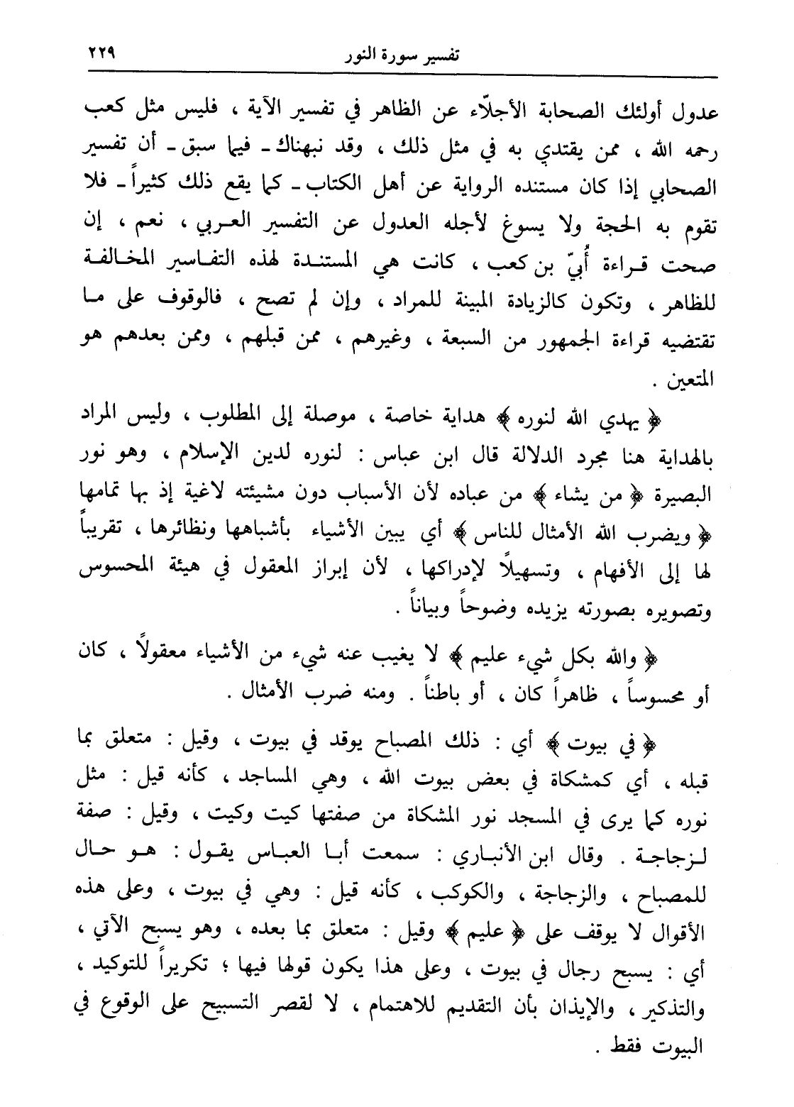 عدول أولئك الصحابة الأجلاء عن الظاهر في تفسير الآية، فليس مثل كعب رحمه الله، ممن يقتدي به في مثل ذلك، وقد نبهناك -فيما سبق- أن تفسير الصحابي إذا كان مستنده الرواية عن أهل الكتاب -كما يقع ذلك كثيراً- فلا تقوم به الحجة ولا يسوغ لأجله العدول عن التفسير العربي، نعم، إن صحت قراءة أُبيّ بن كعب، كانت هي المستندة لهذه التفاسير المخالفة للظاهر، وتكون كالزيادة المبينة للمراد، وإن لم تصح، فالوقوف على ما تقتضيه قراءة الجمهور من السبعة، وغيرهم، ممن قبلهم، وممن بعدهم هو المتعين.