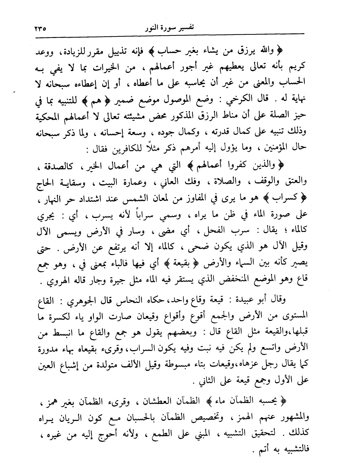 (والذين كفروا أعمالهم) التي هي من أعمال الخير، كالصدقة، والعتق والوقف، والصلاة، وفك العاني، وعمارة البيت، وسقاية الحاج (كسراب) هو ما يرى في المفاوز من لمعان الشمس عند اشتداد حر النهار، على صورة الماء في ظن ما يراه، وسمي سراباً لأنه يسرب، أي: يجري كالماء؛ يقال: سرب الفحل، أي مضى، وسار في الأرض ويسمى الآل وقيل الآل هو الذي يكون ضحى، كالماء إلا أنه يرتفع عن الأرض. حتى يصير كأنه بين السماء والأرض (بقيعة) أي فيها فالباء بمعنى في، وهو جمع قاع وهو الموضع المنخفض الذي يستقر فيه الماء مثل جيرة وجار قاله الهروي.
