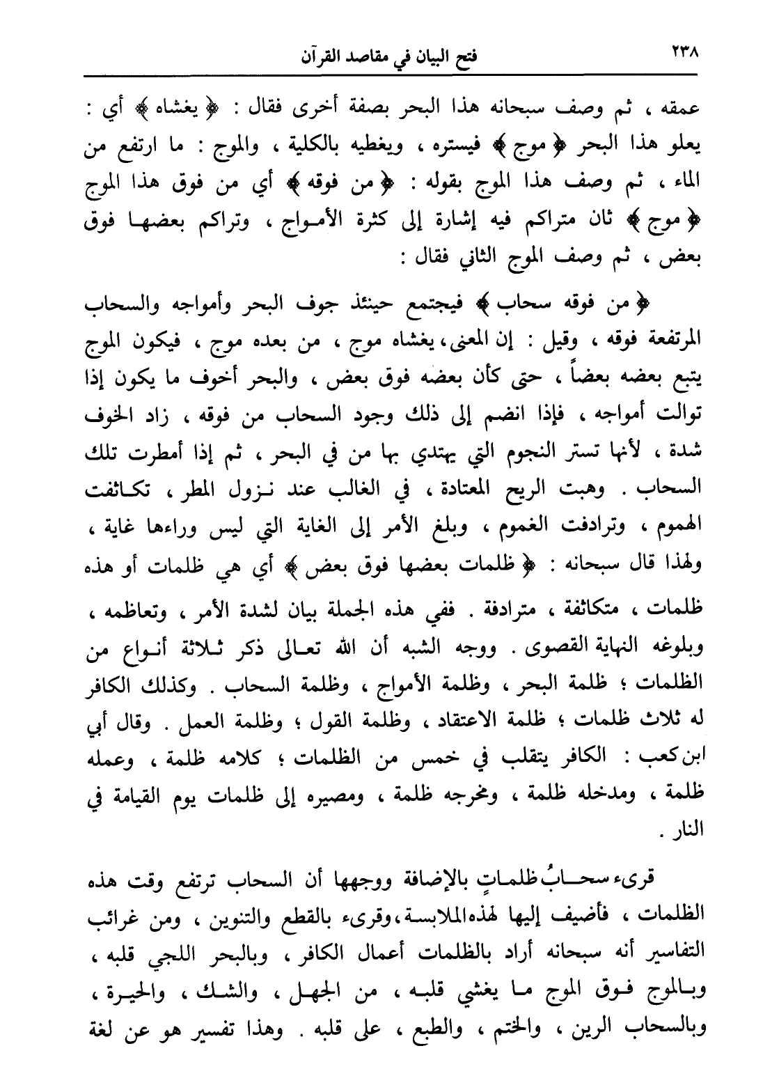 قرئ سحابُ ظلماتٍ بالإضافة ووجهها أن السحاب ترتفع وقت هذه الظلمات، فأضيف إليها لهذه الملابسة، وقرئ بالقطع والتنوين، ومن غرائب التفاسير أنه سبحانه أراد بالظلمات أعمال الكافر، وبالبحر اللجي قلبه، وبالموج فوق الموج ما يغشي قلبه، من الجهل، والشك، والحيرة، وبالسحاب الرين، والختم، والطبع، على قلبه. وهذا تفسير هو عن لغة
