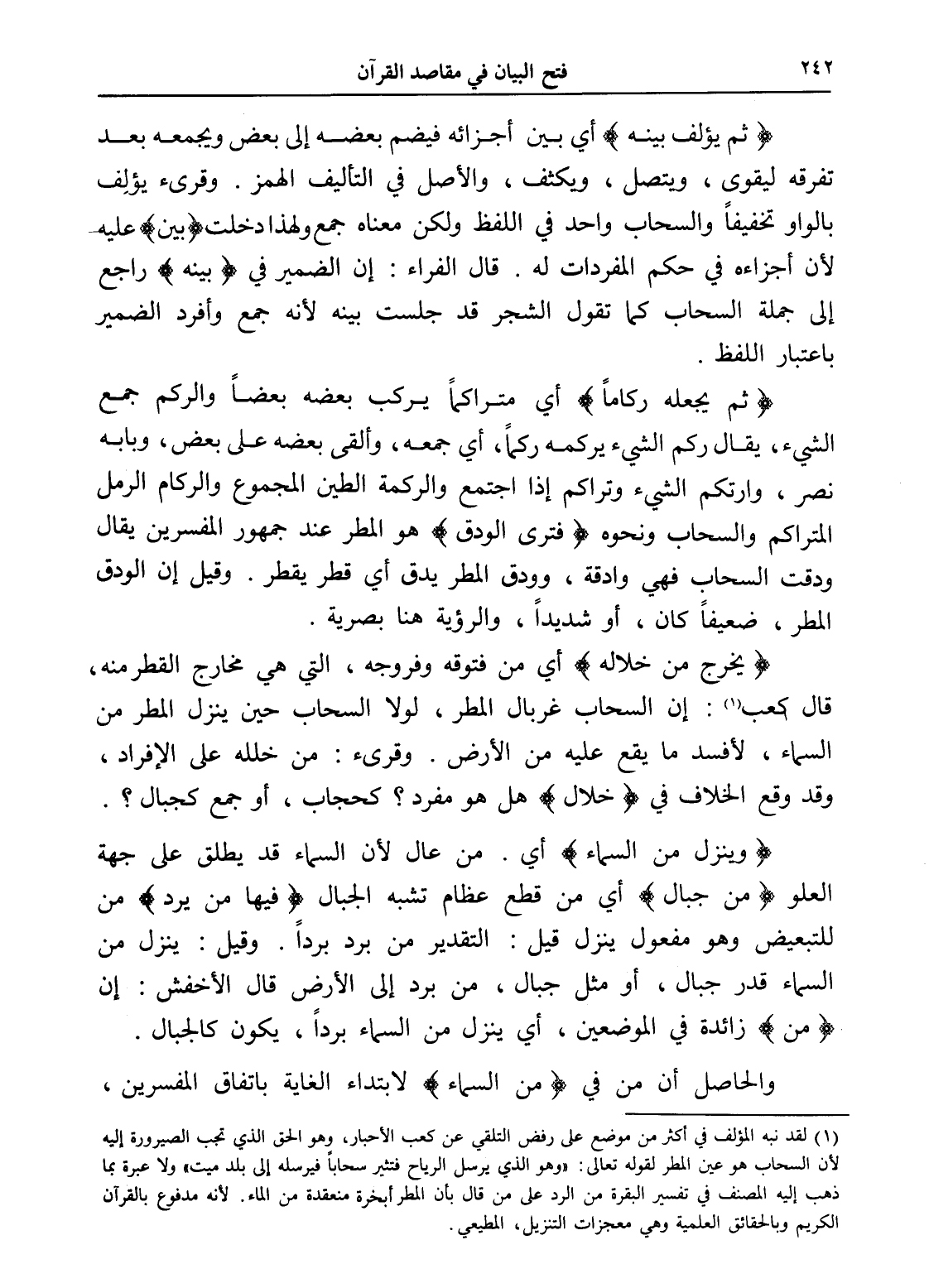 (¬1) لقد نبه المؤلف في أكثر من موضع على رفض التلقي عن كعب الأحبار، وهو الحق الذي تجب الصيرورة إليه لأن السحاب هو عين المطر لقوله تعالى: " وهو الذي يرسل الرياح فتثير سحاباً فيرسله إلى بلد ميت " ولا عبرة بما ذهب إليه المصنف في تفسير البقرة من الرد على من قال بأن المطر أبخرة منعقدة من الماء. لأنه مدفوع بالقرآن الكريم وبالحقائق العلمية وهي معجزات التنزيل، المطيعي.