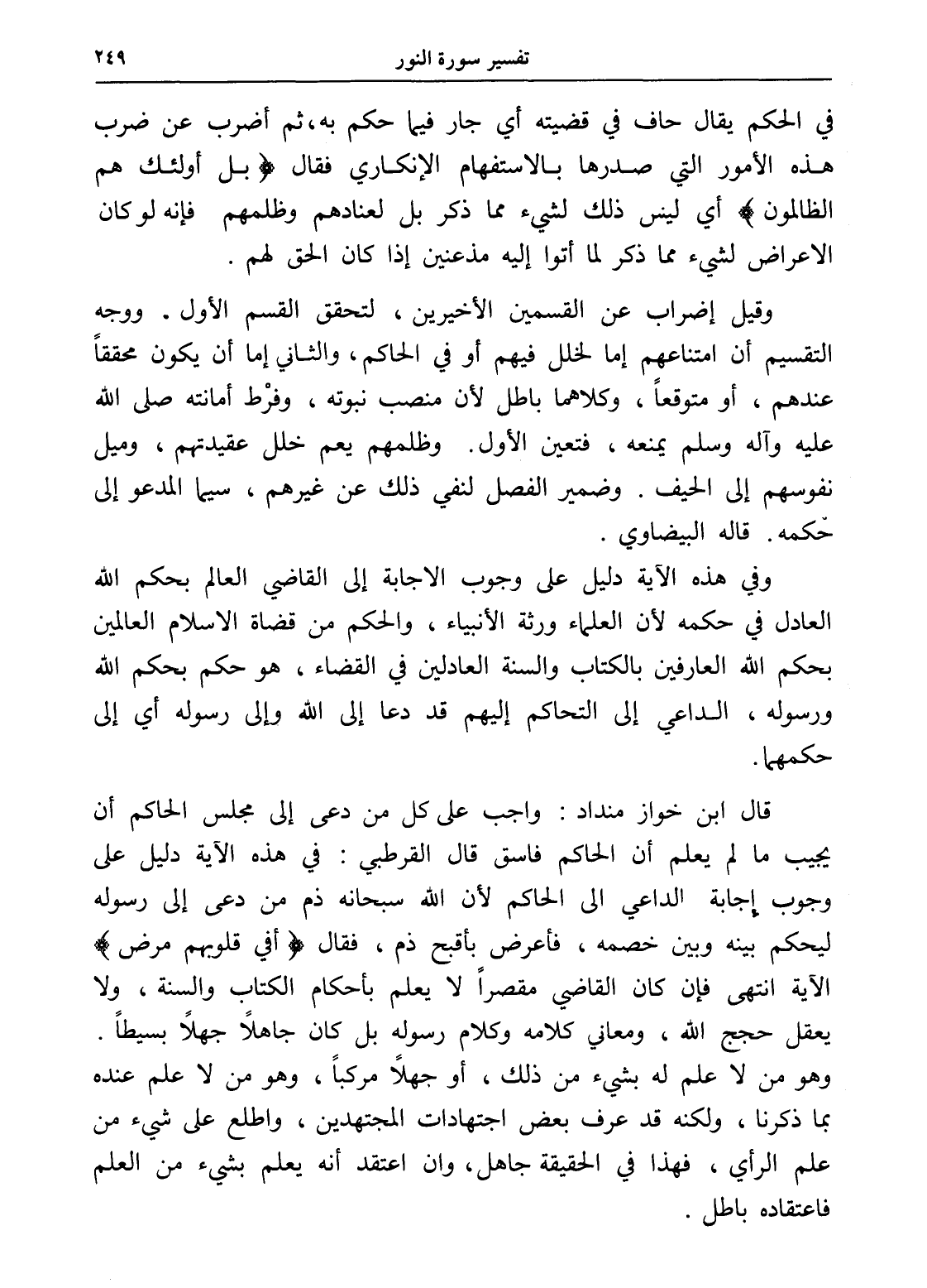 قال ابن خواز منداد: واجب على كل من دعى إلى مجلس الحاكم أن يجيب ما لم يعلم أن الحاكم فاسق قال القرطبي: في هذه الآية دليل على وجوب إجابة الداعي إلى الحاكم لأن الله سبحانه ذم من دعى إلى رسوله ليحكم بينه وبين خصمه، فأعرض بأقبح ذم، فقال (أفي قلوبهم مرض) الآية انتهى فإن كان القاضي مقصراً لا يعلم بأحكام الكتاب والسنة، ولا يعقل حجج الله، ومعاني كلامه وكلام رسوله بل كان جاهلاً جهلاً بسيطاً.