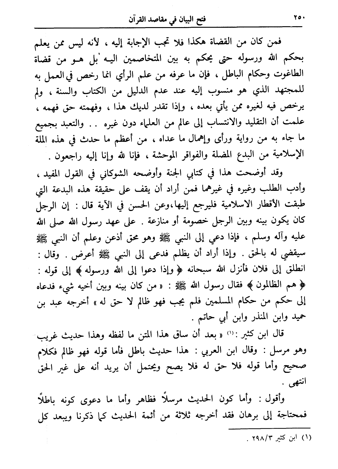 وقد أوضحت هذا في كتابي الجنة وأوضحه الشوكاني في القول المفيد، وأدب الطلب وغيره في غيرهما فمن أراد أن يقف على حقيقة هذه البدعة التي طبقت الأقطار الإسلامية فليرجع إليها، وعن الحسن في الآية قال: إن الرجل كان يكون بينه وبين الرجل خصومة أو منازعة. على عهد رسول الله صلى الله عليه وآله وسلم، فإذا دعي إلى النبي - صلى الله عليه وسلم - وهو محق أذعن وعلم أن النبي - صلى الله عليه وسلم - سيقضي له بالحق. وإذا أراد أن يظلم فدعى إلى النبي - صلى الله عليه وسلم - أعرض. وقال: انطلق إلى فلان فأنزل الله سبحانه (وإذا دعوا إلى الله ورسوله) إلى قوله: (هم الظالمون) فقال رسول الله - صلى الله عليه وسلم -: " من كان بينه وبين أخيه شيء فدعاه إلى حكم من حكام المسلمين فلم يجب فهو ظالم لا حق له " أخرجه عبد بن حميد وابن المنذر وابن أبي حاتم.