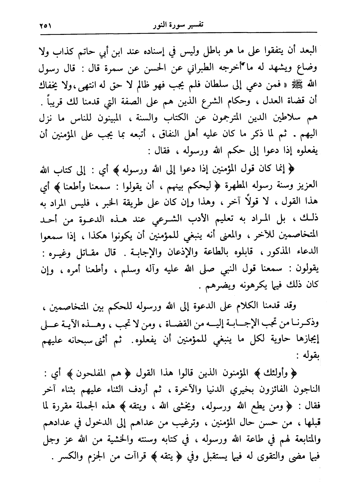البعد أن يتفقوا على ما هو باطل وليس في إسناده عند ابن أبي حاتم كذاب ولا وضاع ويشهد له ما أخرجه الطبراني عن الحسن عن سمرة قال: قال رسول الله - صلى الله عليه وسلم - " فمن دعي إلى سلطان فلم يجب فهو ظالم لا حق له " انتهى، ولا يخفاك أن قضاة العدل، وحكام الشرع الذين هم على الصفة التي قدمنا لك قريباً. هم سلاطين الدين المترجمون عن الكتاب والسنة، المبينون للناس ما نزل إليهم. ثم لما ذكر ما كان عليه أهل النفاق، أتبعه بما يجب على المؤمنين أن يفعلوه إذا دعوا إلى حكم الله ورسوله، فقال: