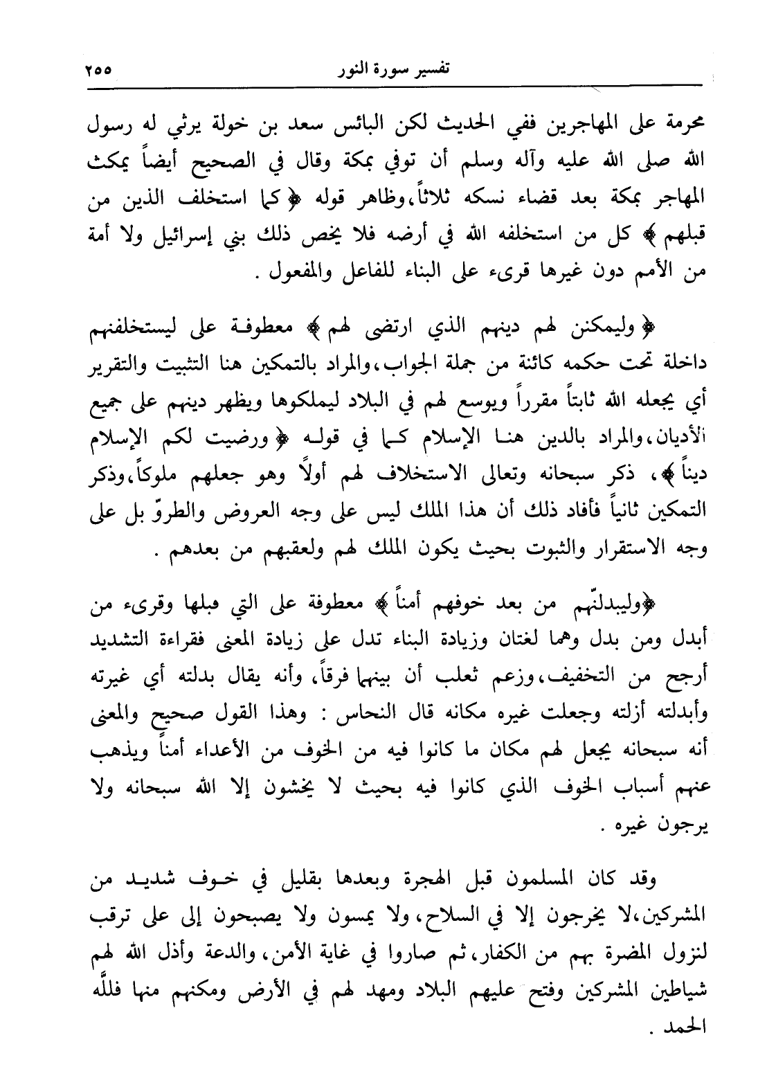 محرمة على المهاجرين ففي الحديث لكن البائس سعد بن خولة يرثي له رسول الله صلى الله عليه وآله وسلم أن توفي بمكة وقال في الصحيح أيضاً يمكث المهاجر بمكة بعد قضاء نسكه ثلاثاً، وظاهر قوله (كما استخلف الذين من قبلهم) كل من استخلفه الله في أرضه فلا يخص ذلك بني إسرائيل ولا أمة من الأمم دون غيرها قرئ على البناء للفاعل والمفعول.