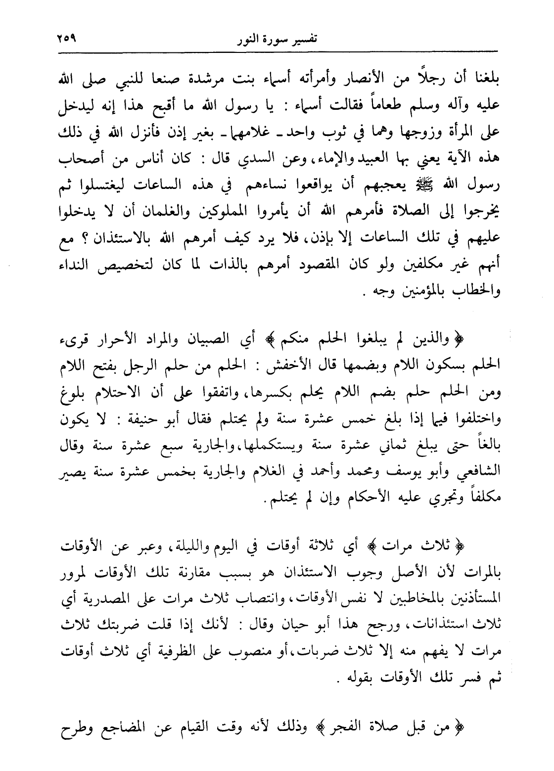 بلغنا أن رجلاً من الأنصار وأمرأته أسماء بنت مرشدة صنعا للنبي صلى الله عليه وآله وسلم طعاماً فقالت أسماء: يا رسول الله ما أقبح هذا إنه ليدخل على المرأة وزوجها وهما في ثوب واحد -غلامهما- بغير إذن فأنزل الله في ذلك هذه الآية يعني بها العبيد والإماء، وعن السدي قال: كان أناس من أصحاب رسول الله - صلى الله عليه وسلم - يعجبهم أن يواقعوا نساءهم في هذه الساعات ليغتسلوا ثم يخرجوا إلى الصلاة فأمرهم الله أن يأمروا المملوكين والغلمان أن لا يدخلوا عليهم في تلك الساعات إلا بإذن، فلا يرد كيف أمرهم الله بالاستئذان؟ مع أنهم غير مكلفين ولو كان المقصود أمرهم بالذات لما كان لتخصيص النداء والخطاب بالمؤمنين وجه.