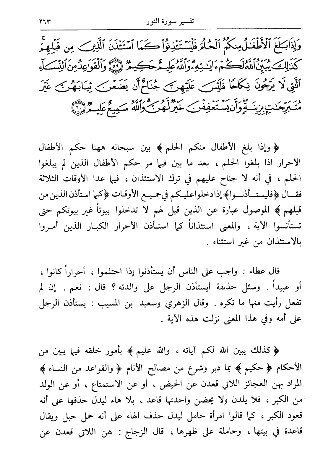 وَإِذَا بَلَغَ الْأَطْفَالُ مِنْكُمُ الْحُلُمَ فَلْيَسْتَأْذِنُوا كَمَا اسْتَأْذَنَ الَّذِينَ مِنْ قَبْلِهِمْ كَذَلِكَ يُبَيِّنُ اللَّهُ لَكُمْ آيَاتِهِ وَاللَّهُ عَلِيمٌ حَكِيمٌ (59) وَالْقَوَاعِدُ مِنَ النِّسَاءِ اللَّاتِي لَا يَرْجُونَ نِكَاحًا فَلَيْسَ عَلَيْهِنَّ جُنَاحٌ أَنْ يَضَعْنَ ثِيَابَهُنَّ غَيْرَ مُتَبَرِّجَاتٍ بِزِينَةٍ وَأَنْ يَسْتَعْفِفْنَ خَيْرٌ لَهُنَّ وَاللَّهُ سَمِيعٌ عَلِيمٌ (60)