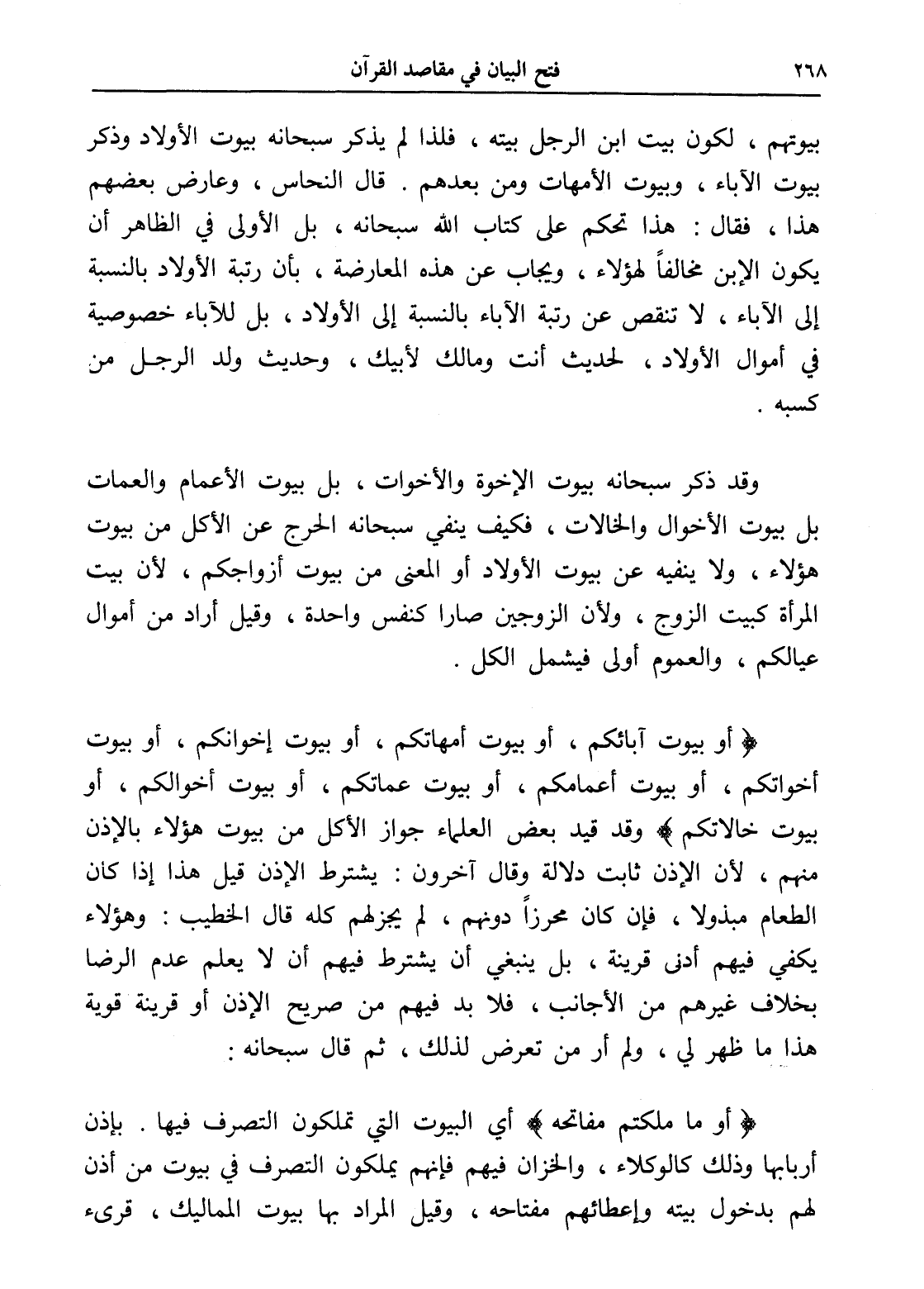(أَوْ بُيُوتِ آبَائِكُمْ أَوْ بُيُوتِ أُمَّهَاتِكُمْ أَوْ بُيُوتِ إِخْوَانِكُمْ أَوْ بُيُوتِ أَخَوَاتِكُمْ أَوْ بُيُوتِ أَعْمَامِكُمْ أَوْ بُيُوتِ عَمَّاتِكُمْ أَوْ بُيُوتِ أَخْوَالِكُمْ أَوْ بُيُوتِ خَالَاتِكُمْ) وقد قيد بعض العلماء جواز الأكل من بيوت هؤلاء بالإذن منهم، لأن الإذن ثابت دلالة وقال آخرون: يشترط الإذن قيل هذا إذا كان الطعام مبذولاً، فإن كان محرزاً دونهم، لم يجز لهم كله قال الخطيب: وهؤلاء يكفي فيهم أدنى قرينة، بل ينبغي أن يشترط فيهم أن لا يعلم عدم الرضا بخلاف غيرهم من الأجانب، فلا بد فيهم من صريح الإذن أو قرينة قوية هذا ما ظهر لي، ولم أر من تعرض لذلك، ثم قال سبحانه: