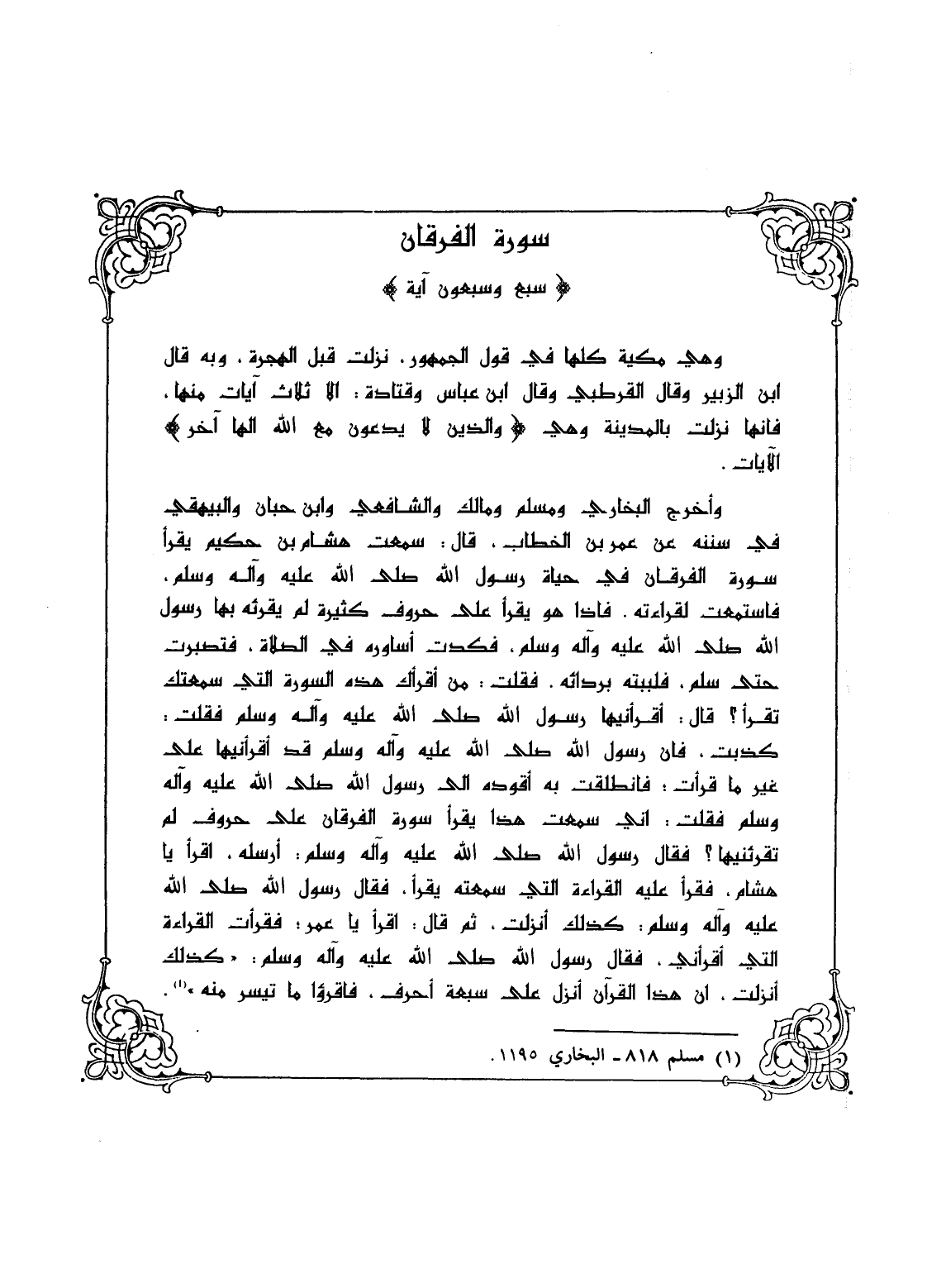 وأخرج البخاري ومسلم ومالك والشافعي وابن حبان والبيهقي في سننه عن عمر بن الخطاب، قال: سمعت هشام بن حكيم يقرأ سورة الفرقان في حياة رسول الله صلى الله وعليه وآله وسلم، فاستمعت لقراءته. فإذا هو يقرأ على حروف كثيرة لم يقرئه بها رسول الله صلى الله عليه وآله وسلم، فكدت أساوره في الصلاة، فتصبرت حتى سلم، فلببته بردائه. فقلت: من أقرأك هذه السورة التي سمعتك تقرأ؟ قال: أقرأنيها رسول الله صلى الله عليه وآله وسلم فقلت: كذبت، فإن رسول الله صلى الله عليه وآله وسلم قد أقرأنيها على غير ما قرأت: فانطلقت به أقوده إلى رسول الله صلى الله عليه وآله وسلم فقلت: إني سمعت هذا يقرأ سورة الفرقان على حروف لم تقرأنيها؟ فقال رسول الله صلى الله عليه وآله وسلم: " أرسله، اقرأ يا هشام "، فقرأ عليه القراءة التي سمعته يقرأ، فقال رسول الله صلى الله عليه وآله وسلم: " كذلك أنزلت "، ثم قال: أقرأ يا عمر، فقرأت القراءة التي أقرأني، فقال رسول الله صلى الله عليه وآله وسلم: " كذلك أنزلت، إن هذا القرآن أنزل على سبعة أحرف، فاقرؤا ما تيسر منه " (¬1).