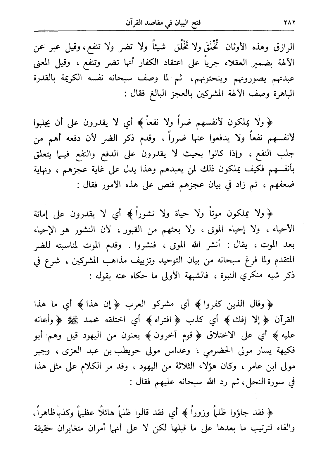 (ولا يملكون موتاً ولا حياة ولا نشوراً) أي لا يقدرون على إماتة الأحياء، ولا إحياء الموتى، ولا بعثهم من القبور، لأن النشور هو الإحياء بعد الموت، يقال: أنشر الله الموتى، فنشروا. وقدم الموت لمناسبته للضر المتقدم ولما فرغ سبحانه من بيان التوحيد وتزييف مذاهب المشركين، شرع في ذكر شبه منكري النبوة، فالشبهة الأولى ما حكاه عنه بقوله:
