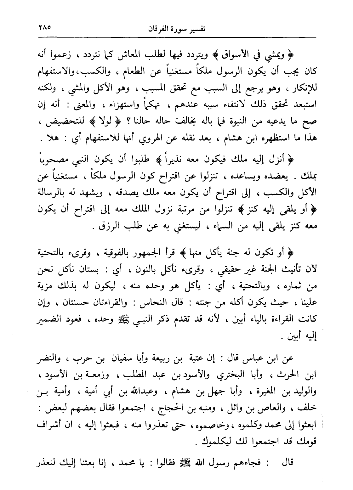 عن ابن عباس قال: إن عتبة بن ربيعة وأبا سفيان بن حرب، والنضر ابن الحرث، وأبا البختري والأسود بن عبد المطلب، وزمعة بن الأسود، والوليد بن المغيرة، وأبا جهل بن هشام، وعبد الله بن أبي أمية، وأمية بن خلف، والعاص بن وائل، ومنبه بن الحجاج، اجتمعوا فقال بعضهم لبعض: ابعثوا إلى محمد وكلموه، وخاصموه، حتى تعذروا منه، فبعثوا إليه، إن أشراف قومك قد اجتمعوا لك ليكلموك.