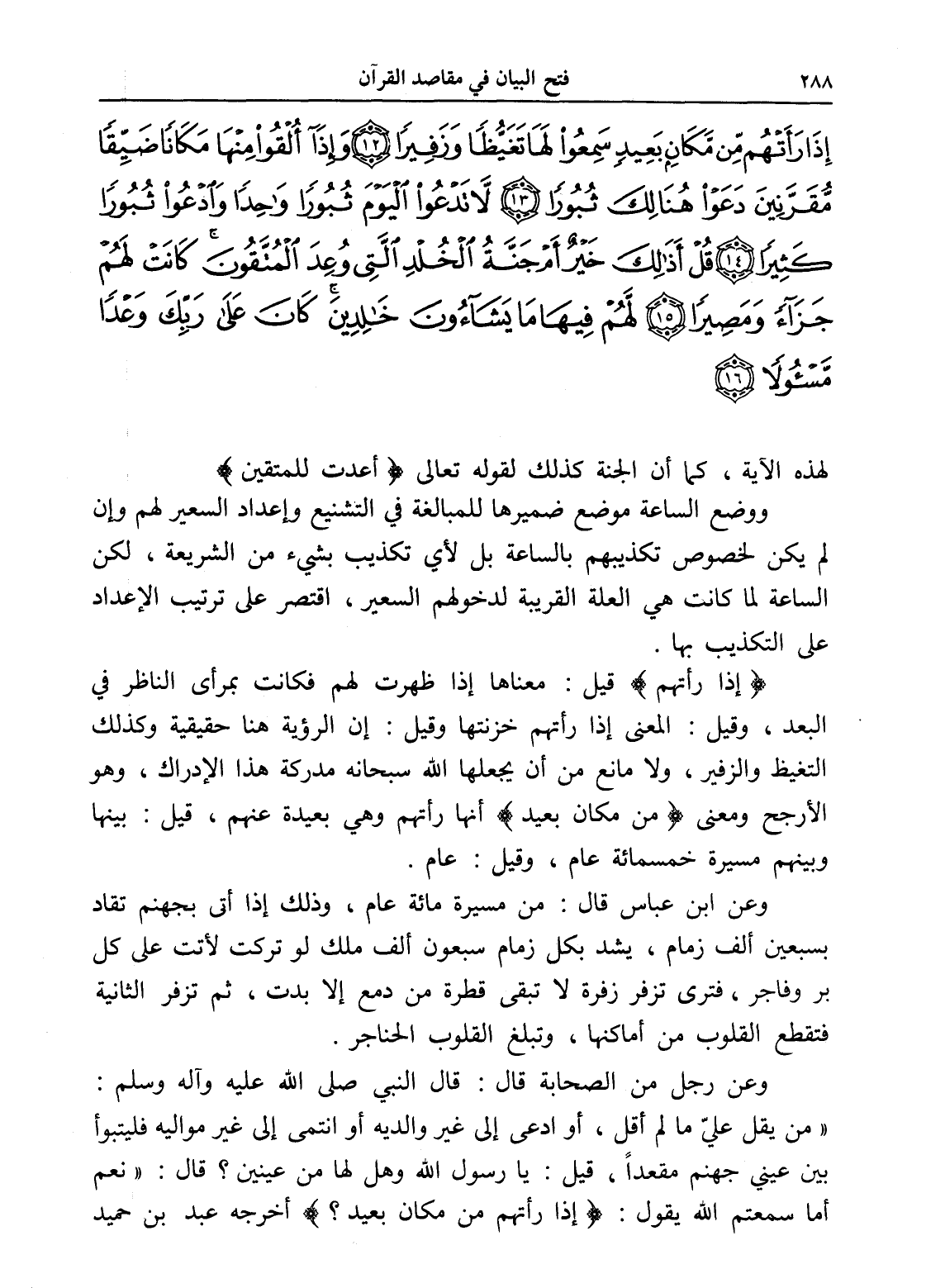 إِذَا رَأَتْهُمْ مِنْ مَكَانٍ بَعِيدٍ سَمِعُوا لَهَا تَغَيُّظًا وَزَفِيرًا (12) وَإِذَا أُلْقُوا مِنْهَا مَكَانًا ضَيِّقًا مُقَرَّنِينَ دَعَوْا هُنَالِكَ ثُبُورًا (13) لَا تَدْعُوا الْيَوْمَ ثُبُورًا وَاحِدًا وَادْعُوا ثُبُورًا كَثِيرًا (14) قُلْ أَذَلِكَ خَيْرٌ أَمْ جَنَّةُ الْخُلْدِ الَّتِي وُعِدَ الْمُتَّقُونَ كَانَتْ لَهُمْ جَزَاءً وَمَصِيرًا (15) لَهُمْ فِيهَا مَا يَشَاءُونَ خَالِدِينَ كَانَ عَلَى رَبِّكَ وَعْدًا مَسْئُولًا (16)