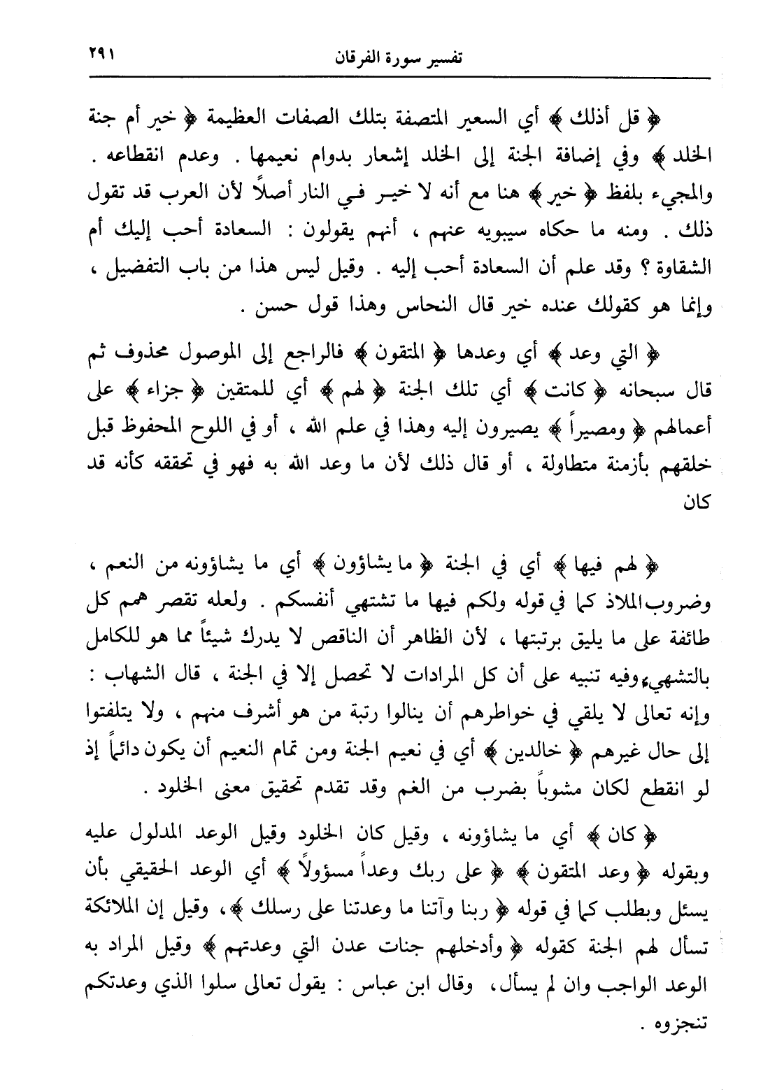 (قل أذلك) أي السعير المتصفة بتلك الصفات العظيمة (خير أم جنة الخلد) وفي إضافة الجنة إلى الخلد إشعار بدوام نعيمها. وعدم انقطاعه. والمجيء بلفظ (خير) هنا مع أنه لا خير في النار أصلاً لأن العرب قد تقول ذلك. ومنه ما حكاه سيبويه عنهم، أنهم يقولون: السعادة أحب إليك أم الشقاوة؟ وقد علم أن السعادة أحب إليه. وقيل ليس هذا من باب التفضيل، وإنما هو كقولك عنده خير قال النحاس وهذا قول حسن.