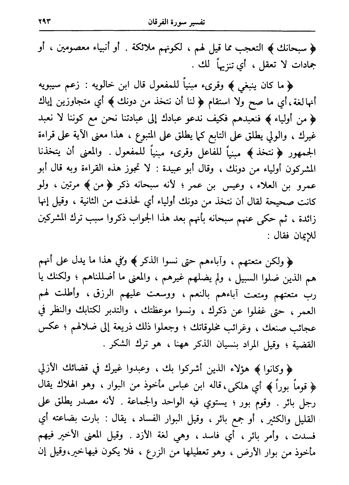 (وكانوا) هؤلاء الذين أشركوا بك، وعبدوا غيرك في قضائك الأزلي (قوماً بوراً) أي هلكى، قاله ابن عباس مأخوذ من البوار، وهو الهلاك يقال رجل بائر. وقوم بور؛ يستوي فيه الواحد والجماعة. لأنه مصدر يطلق على القليل والكثير، أو جمع بائر، وقيل البوار الفساد، يقال: بارت بضاعته أي فسدت، وأمر بائر، أي فاسد، وهي لغة الأزد. وقيل المعنى الأخير فيهم مأخوذ من بوار الأرض، وهو تعطيلها من الزرع، فلا يكون فيها خير، وقيل إن